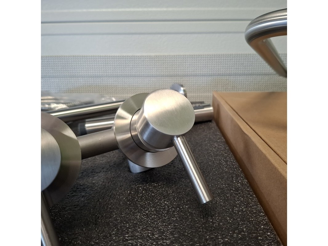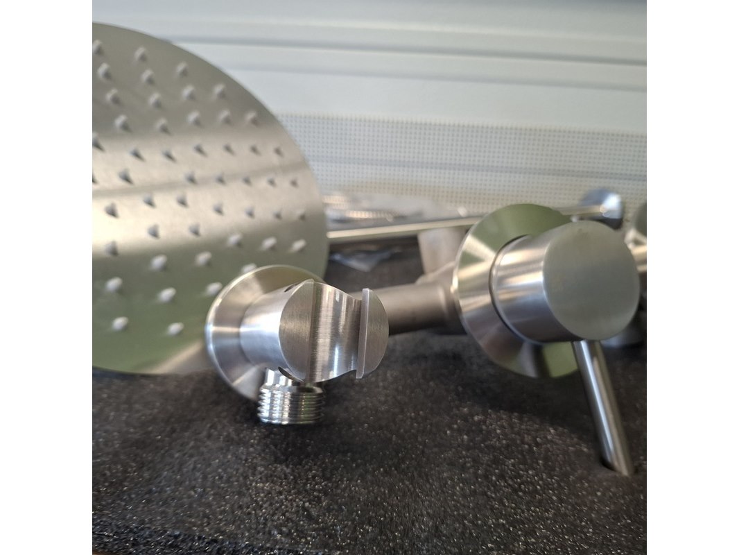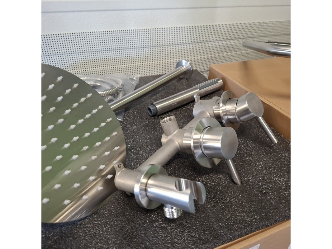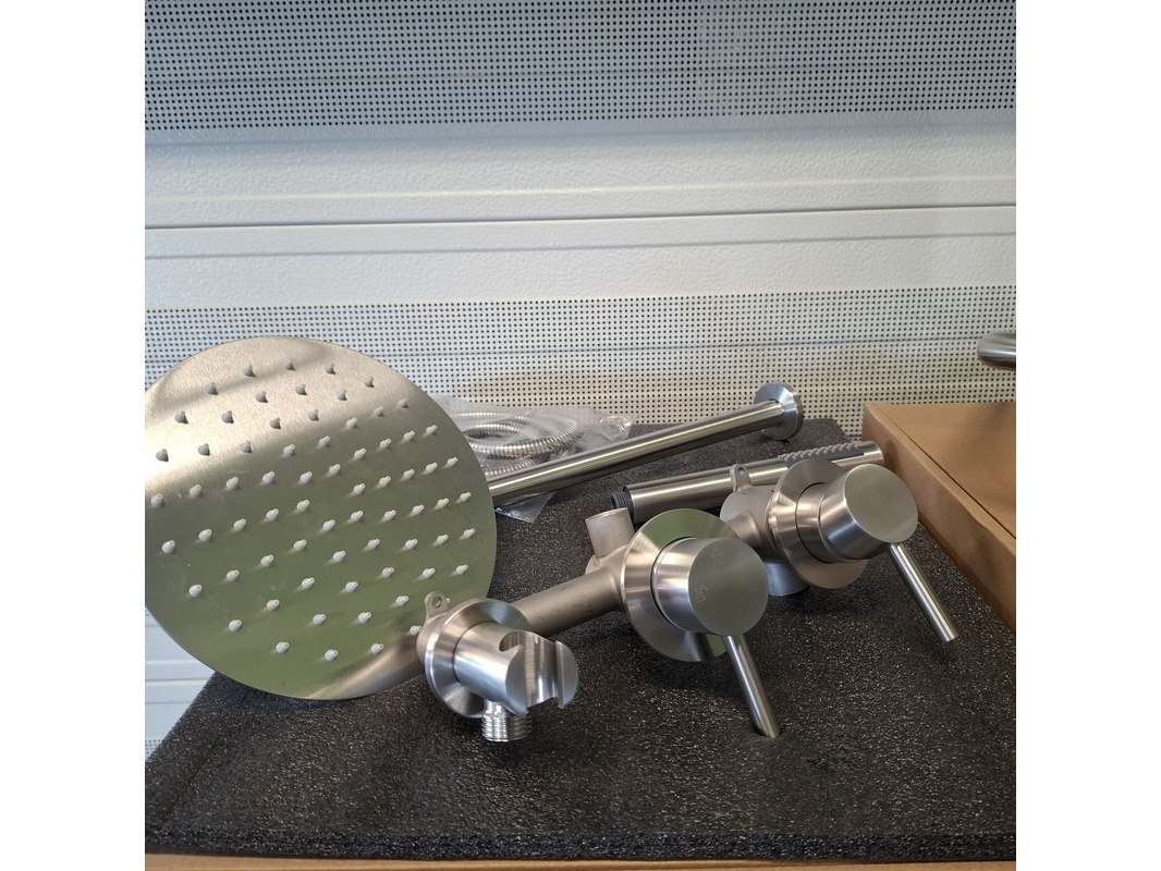 Product: Regendoucheset Kleur: rvs geborsteld Materiaal: rvs Afmeting: H.O.H. 150 mm Specificaties: inbouwdouchekraan, opbouwstang, regendouche 200mm met anti-kalk nozzles, staafhanddouche, verstelbare houder, doucheslang 150cm, alles in-én opbouwdelen