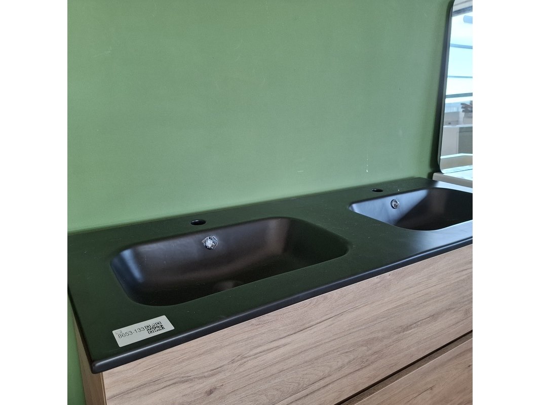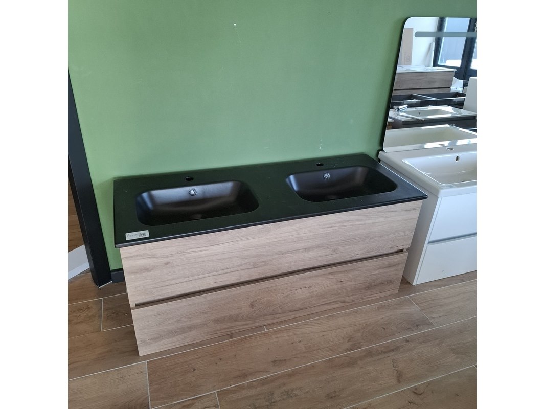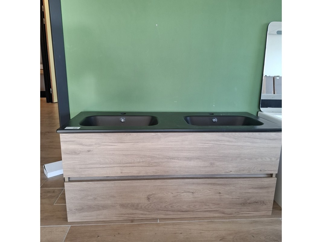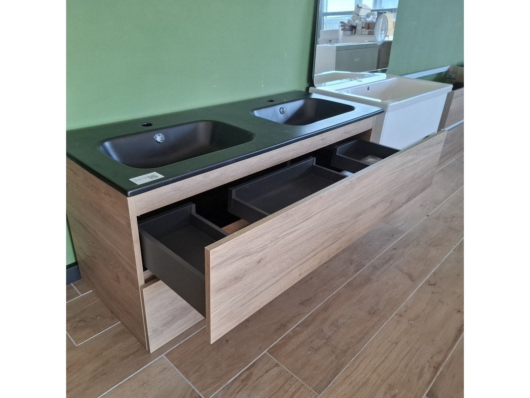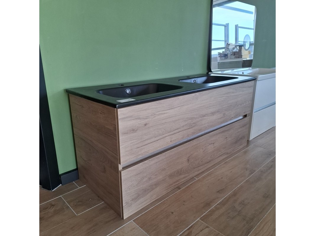 Merk: HR Badmeubelen Product: Badmeubel Kleur: eiken Afmeting: 120x46cm Specificaties: 2 lades met softclose, greeploos, keramische wastafel, mat zwart, 2 bakken, 2 kraangaten, 2x wastafelkraan, rvs-geborsteld, 2x click-waste, rvs-geborsteld, 1x hoge kast, 160x35x35cm, 2 deuren met softclose, (links of rechts te plaatsen)