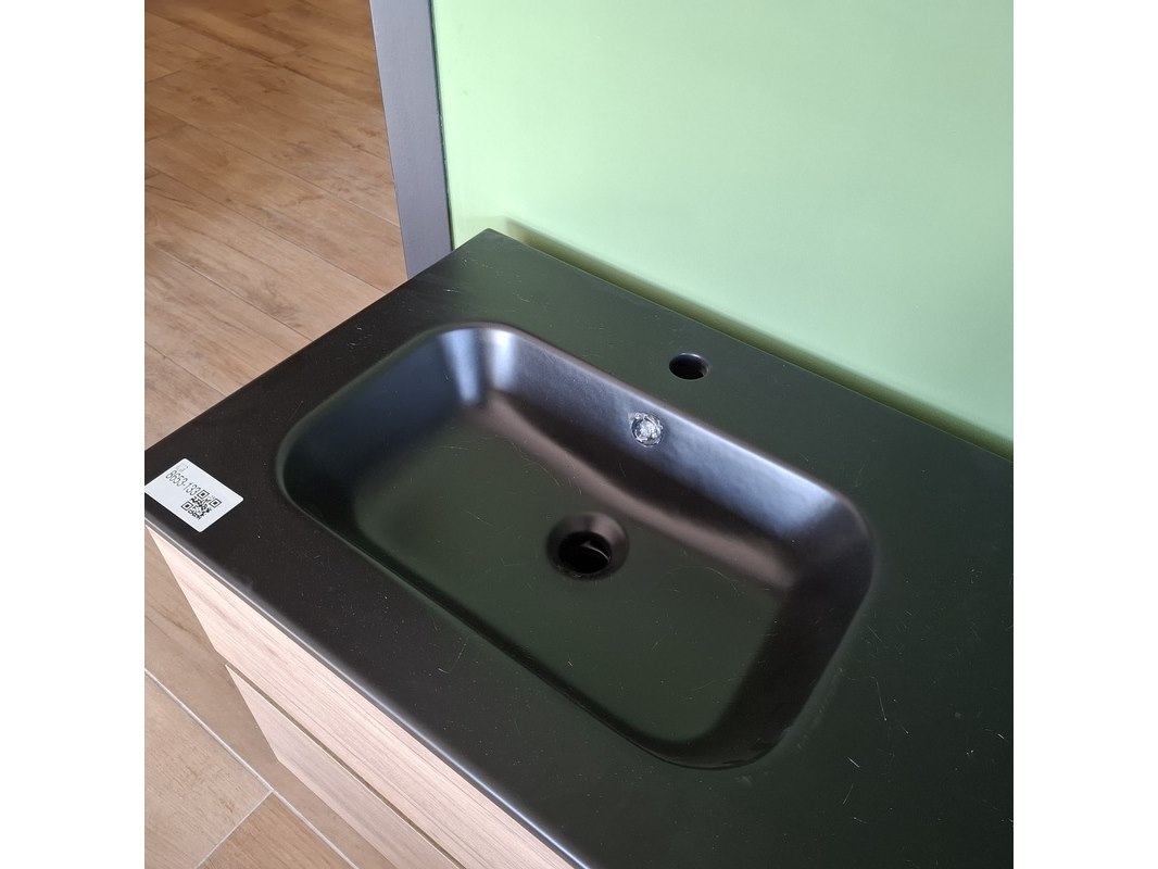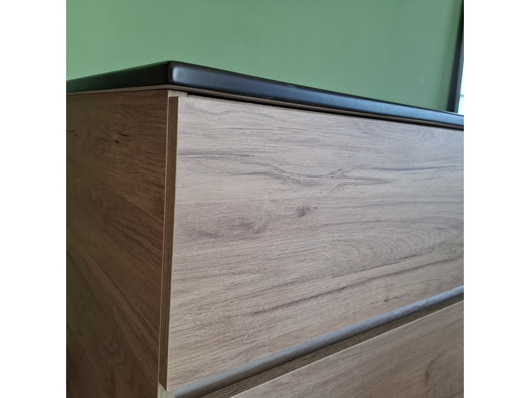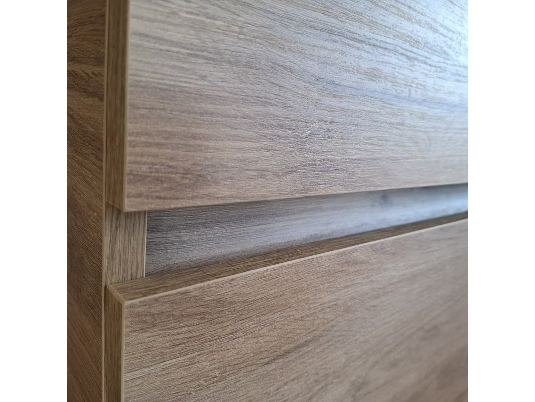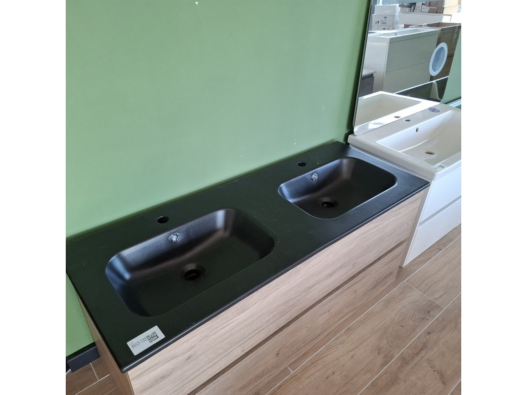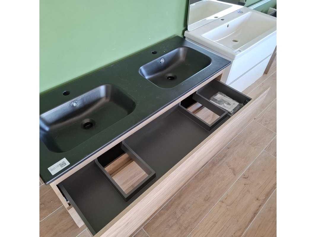 Merk: HR Badmeubelen Product: Badmeubel Kleur: eiken Afmeting: 120x46cm Specificaties: 2 lades met softclose, greeploos, keramische wastafel, mat zwart, 2 bakken, 2 kraangaten, 2x wastafelkraan, rvs-geborsteld, 2x click-waste, rvs-geborsteld, 1x hoge kast, 160x35x35cm, 2 deuren met softclose, (links of rechts te plaatsen)
