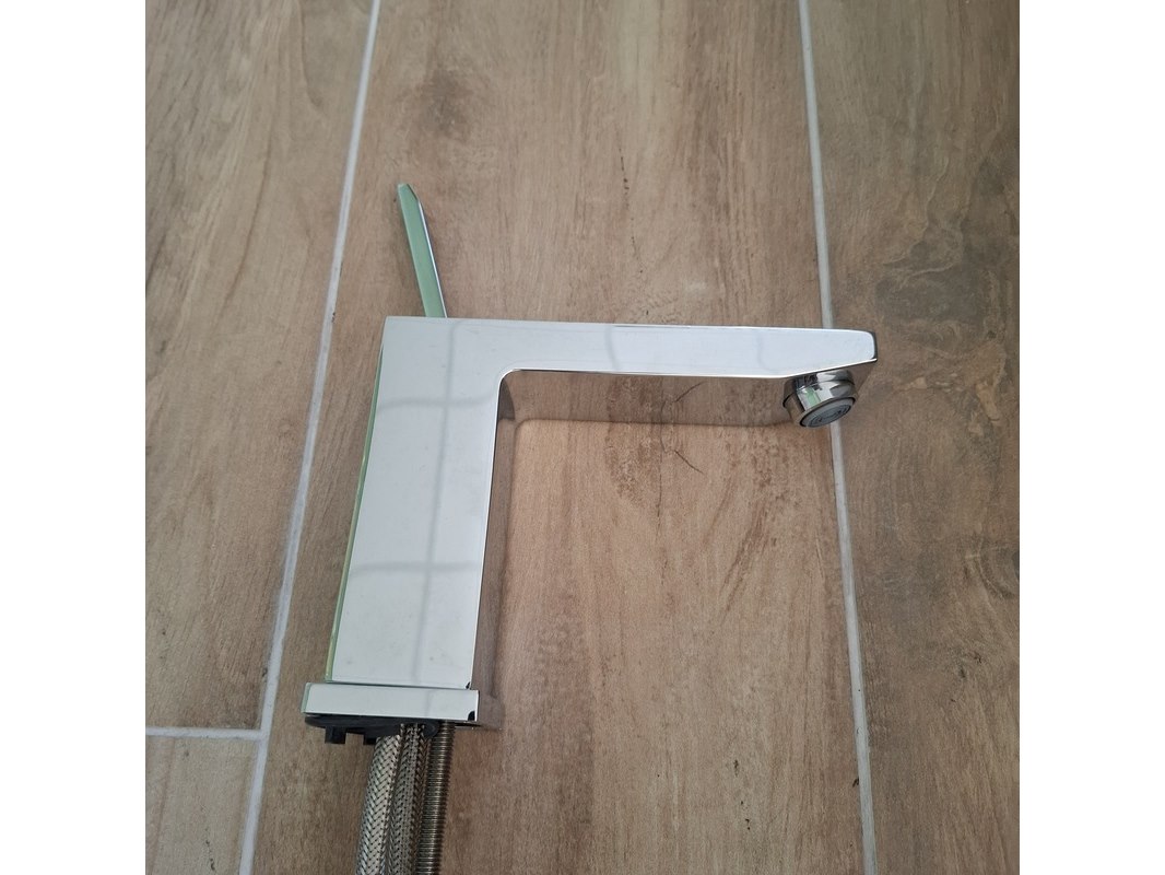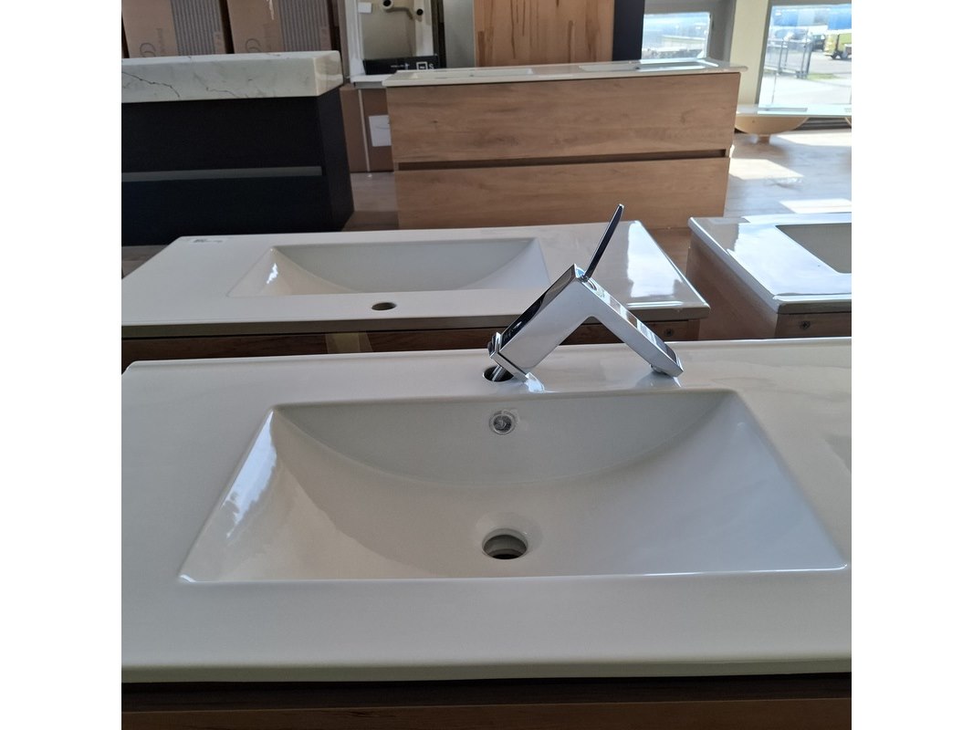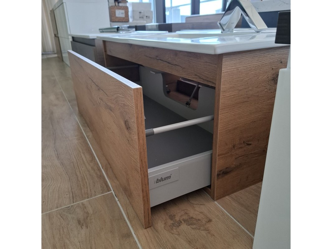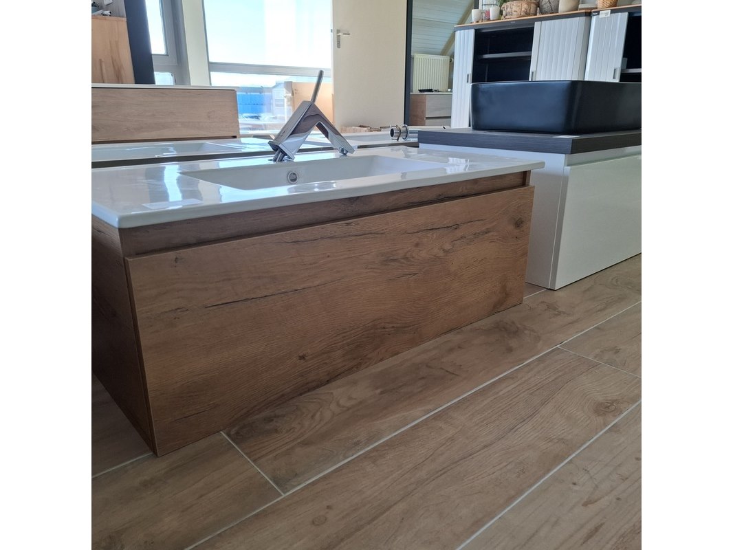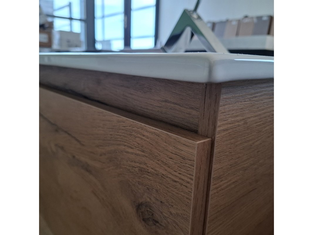 Merk: Lanesto Product: Badmeubel Kleur: medium oak Afmeting: 90x46cm Specificaties: 1 lade met softclose, met Blum lade-geleide systeem, greeploos, wastafel, keramiek, glans wit, 1 bak, 1 kraangat, met Grohe wastafelkraan