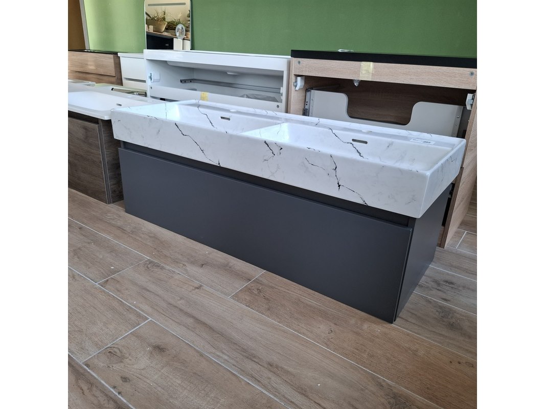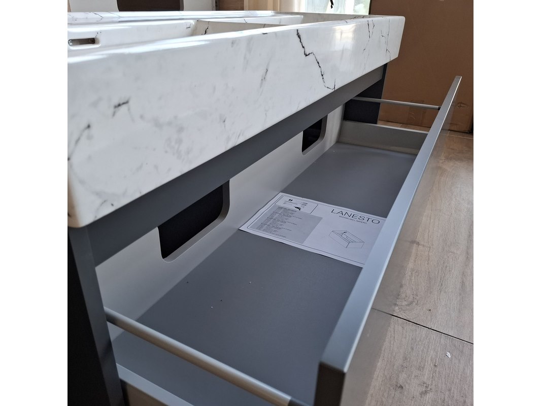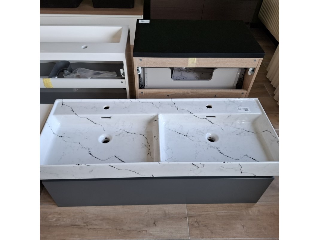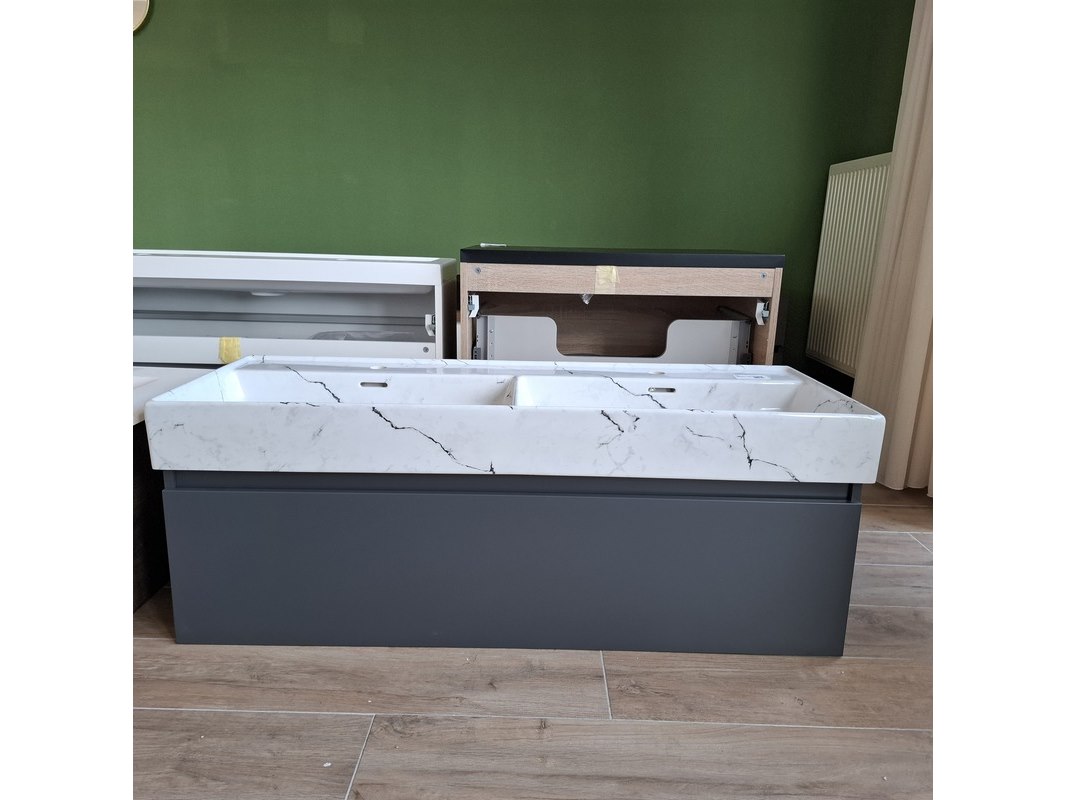 Merk: Lanesto Product: Badmeubel Kleur: mat antraciet Afmeting: 120x46cm Specificaties: 1 lade met softclose, met Blum lade-geleide systeem, greeploos, wastafel, keramiek, calcatta, 2 bakken, 2 kraangaten