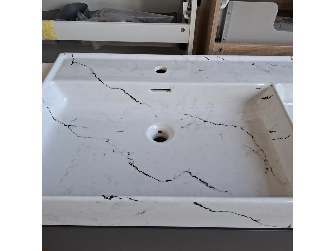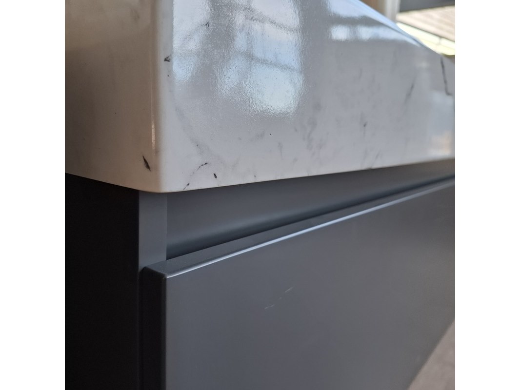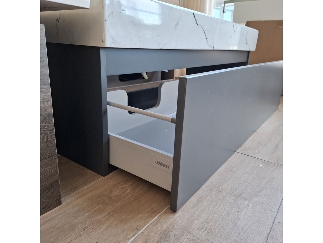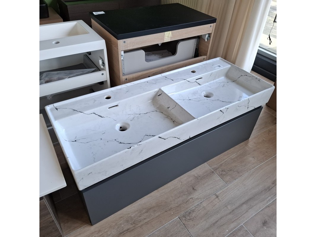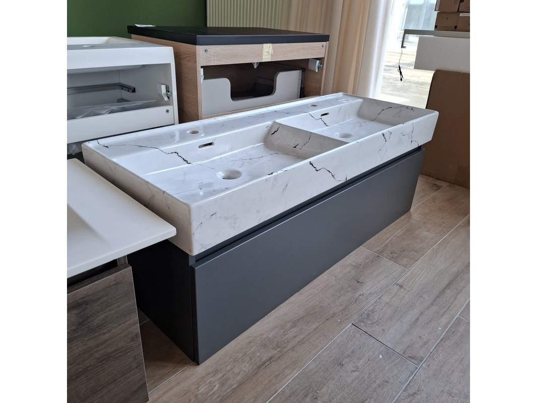 Merk: Lanesto Product: Badmeubel Kleur: mat antraciet Afmeting: 120x46cm Specificaties: 1 lade met softclose, met Blum lade-geleide systeem, greeploos, wastafel, keramiek, calcatta, 2 bakken, 2 kraangaten