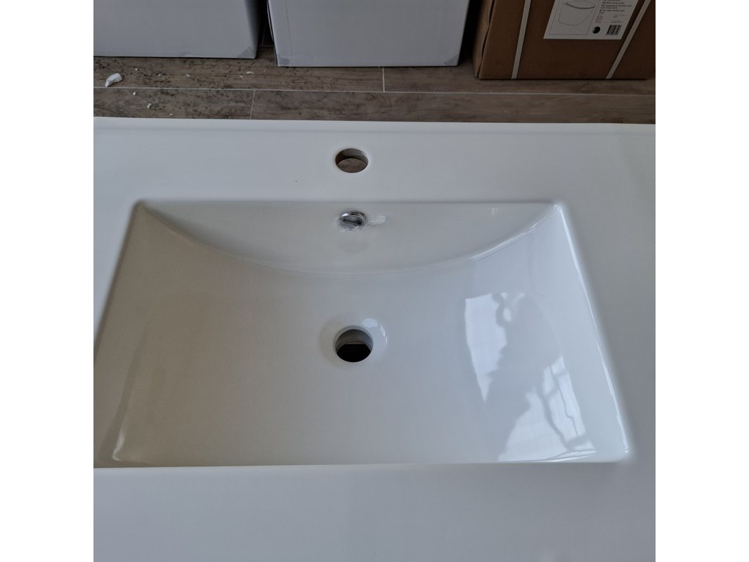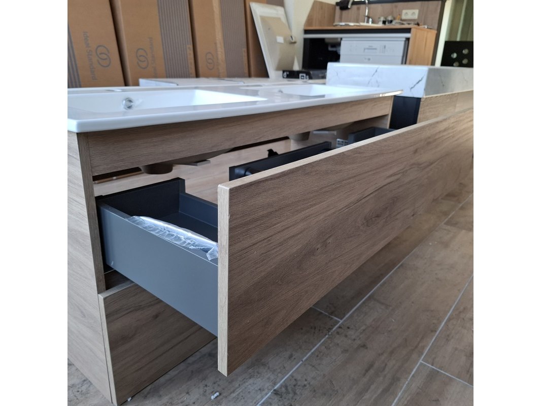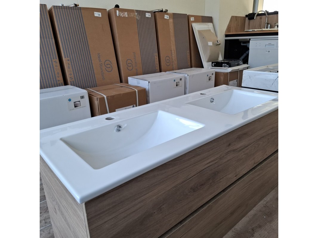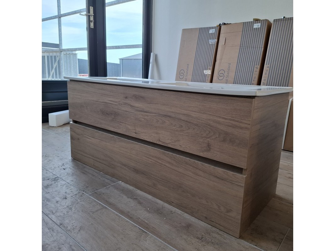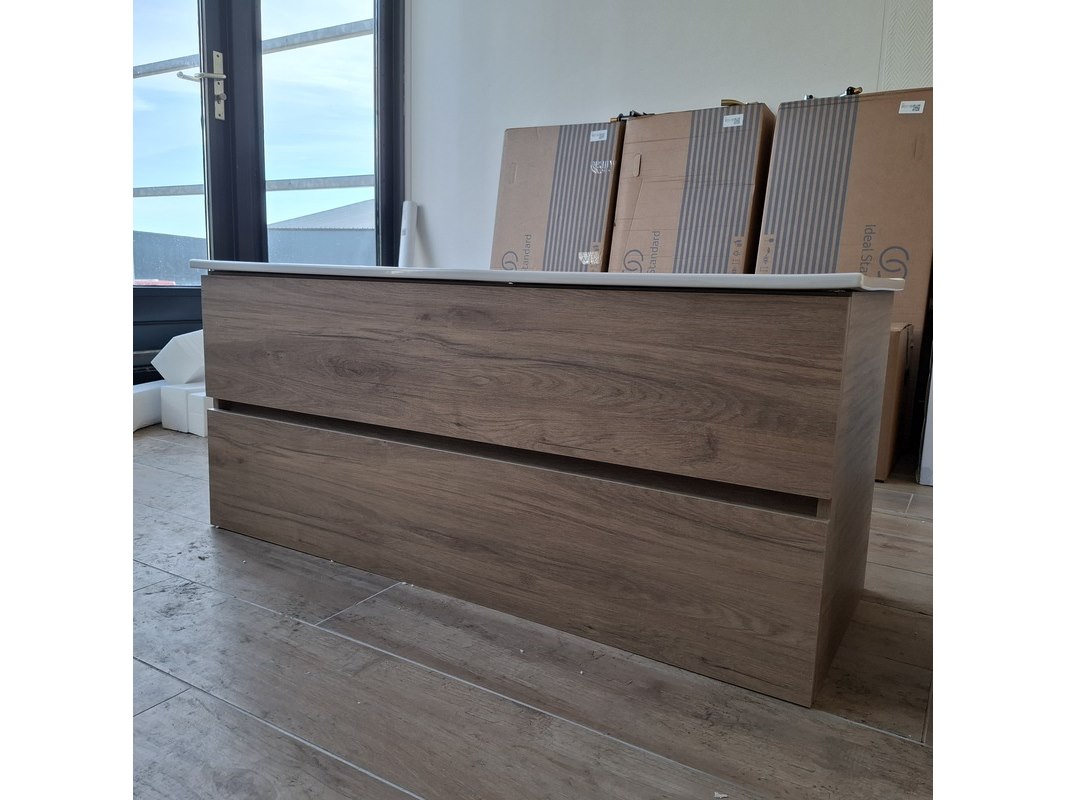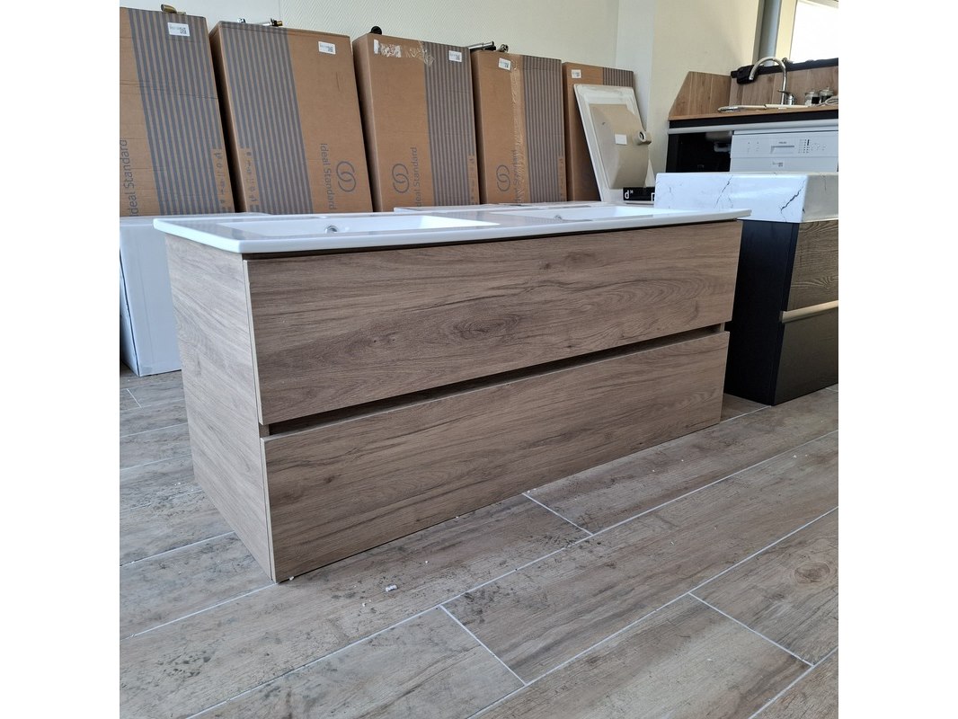Merk: HR Badmeubelen Product: Badmeubel Kleur: eiken Afmeting: 120x46cm Specificaties: 2 lades met softclose, greeploos, wastafel, wit, 2 bakken, 2 kraangaten