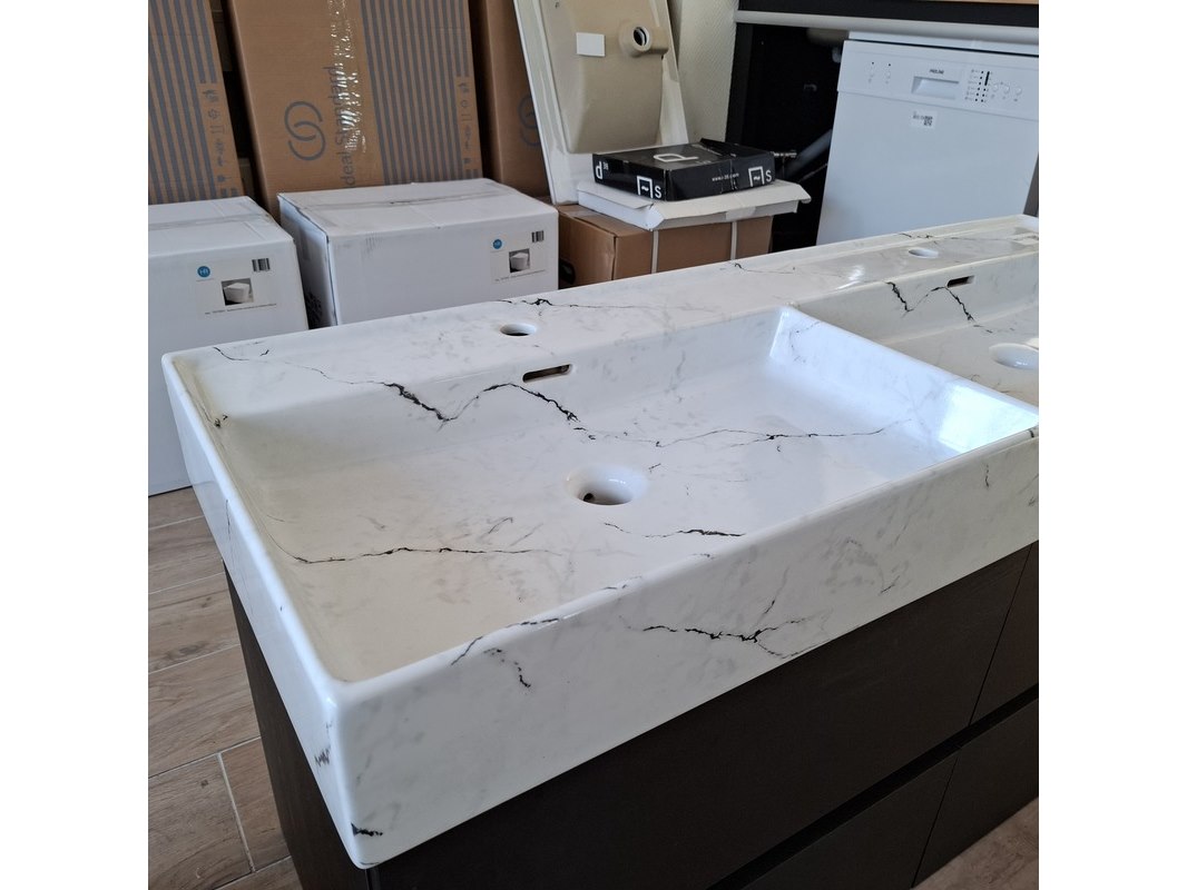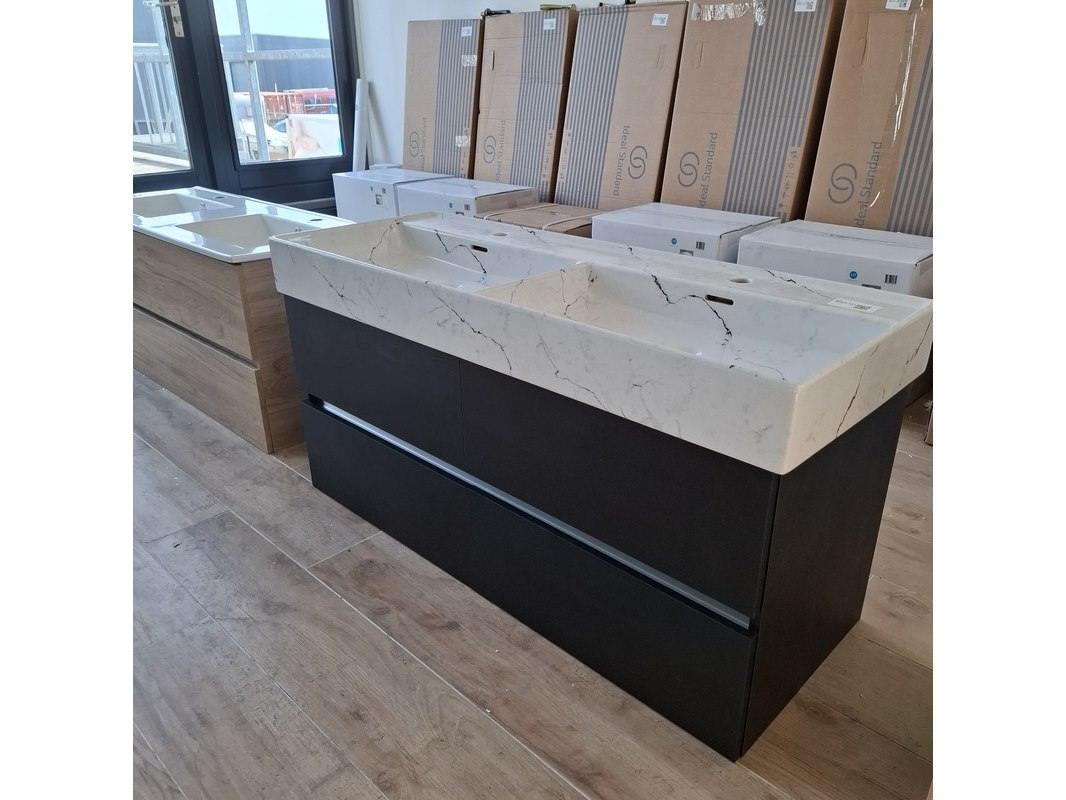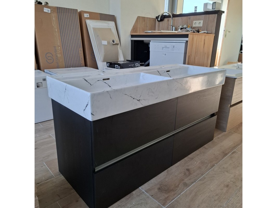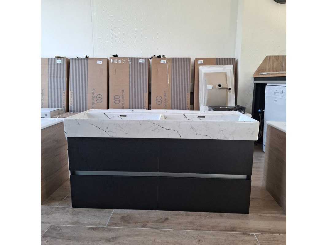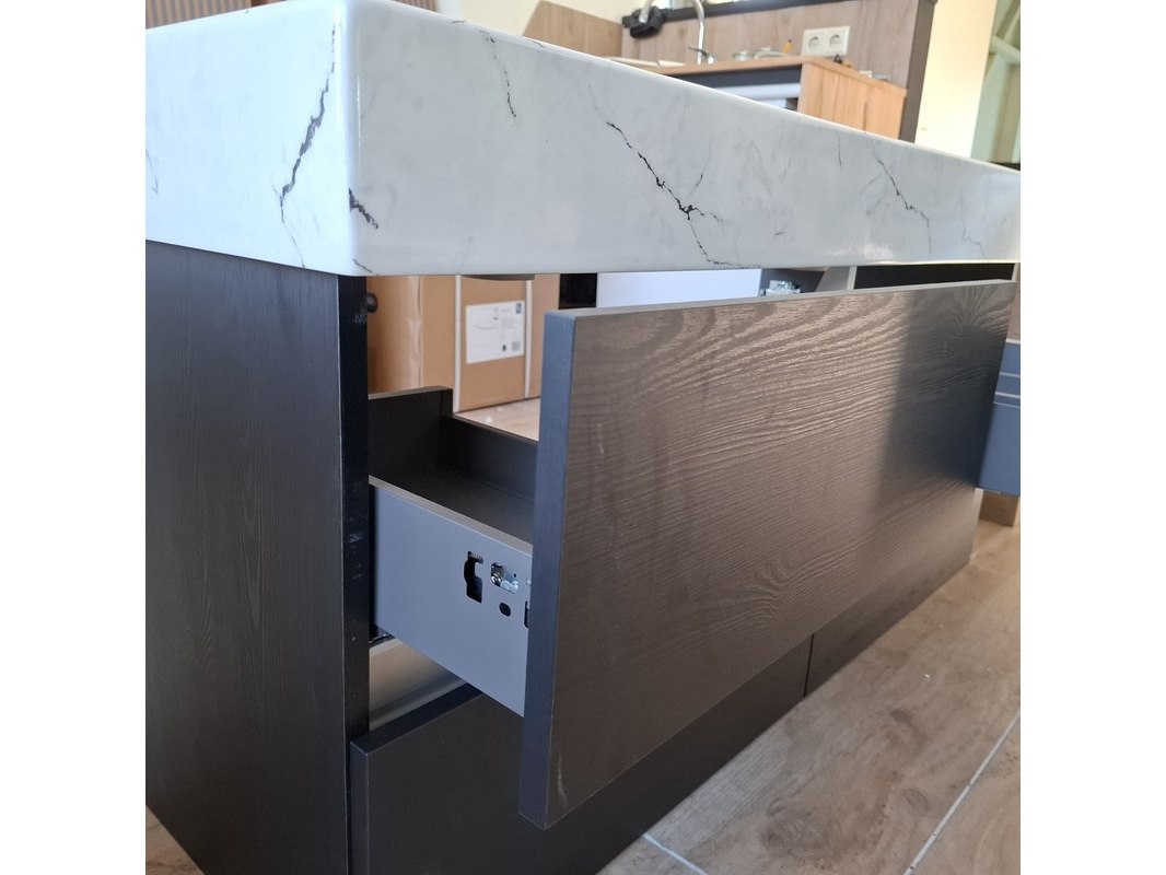 Merk: HR Badmeubelen Product: Badmeubel Kleur: black oak Afmeting: 120x46cm Specificaties: 4 lades met softclose, greeploos, wastafel, keramiek, calcatta