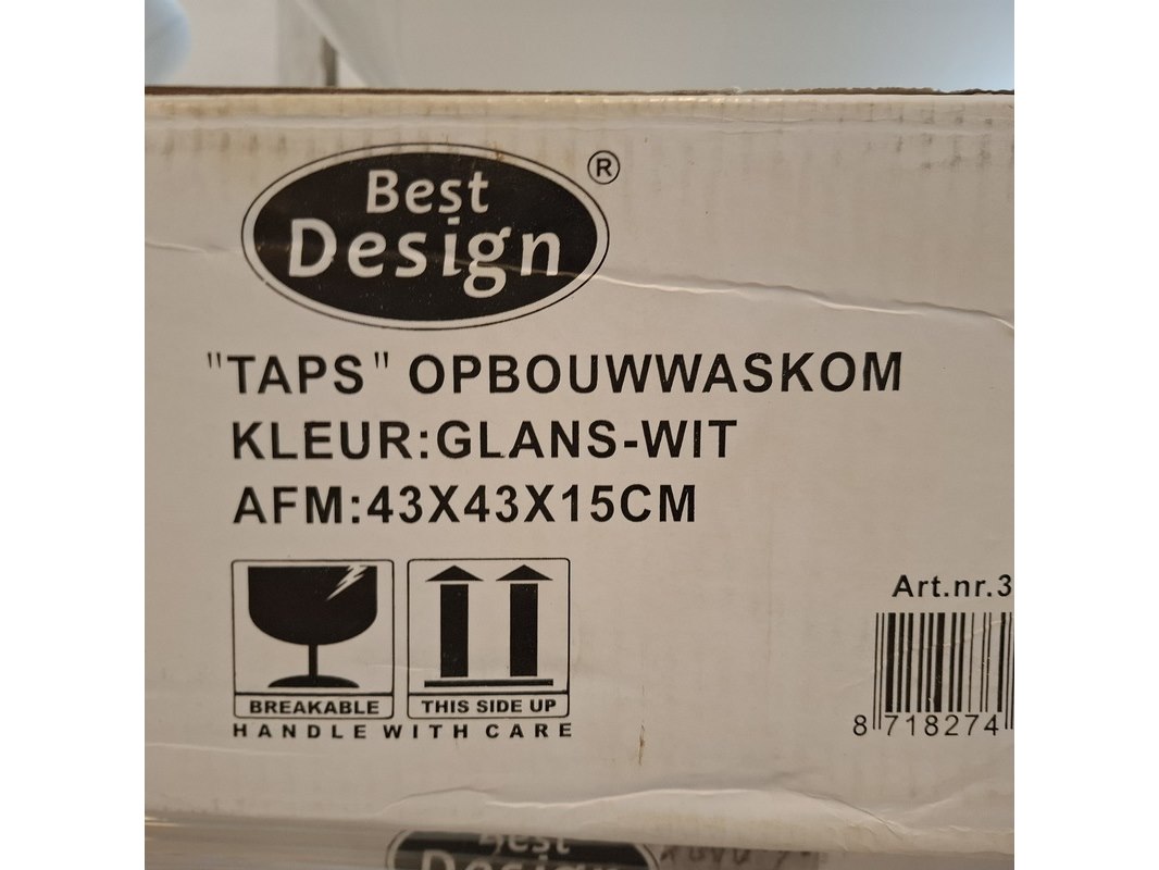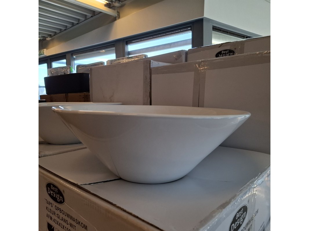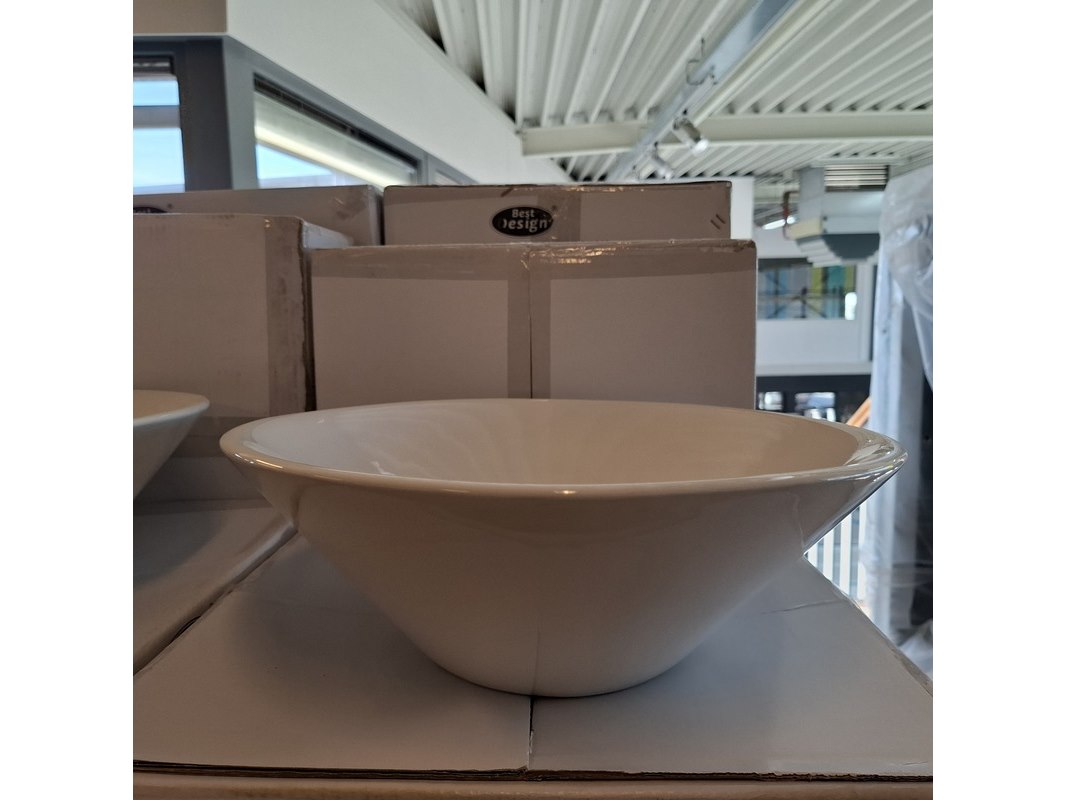 Merk: Best Design Product: Waskom Kleur: glans wit Materiaal: keramiek Afmeting: Ø 43x15cm Specificaties: art.nr. 3860530, EAN 8718274535624