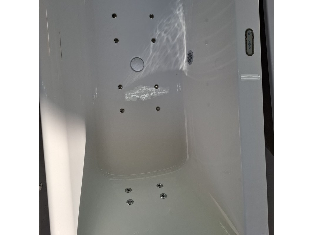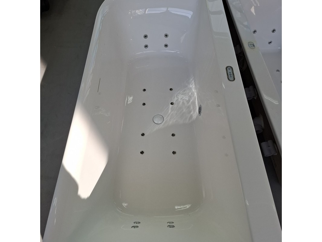 Merk: back to the wall Product: Whirlpool Kleur: glans wit Materiaal: acryl Afmeting: 180x80x60cm Specificaties: systeem: 1x4 rugjets, 1x4 voetenjets, 1.0 pk hydromotor, 8 luchtjets, 1000 watt blower, elektronisch display, incl. overloopcombinatie, incl. potenset 12 maanden garantie op het whirlpoolsysteem.