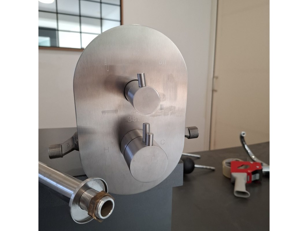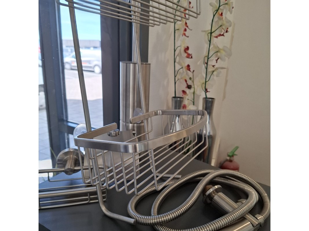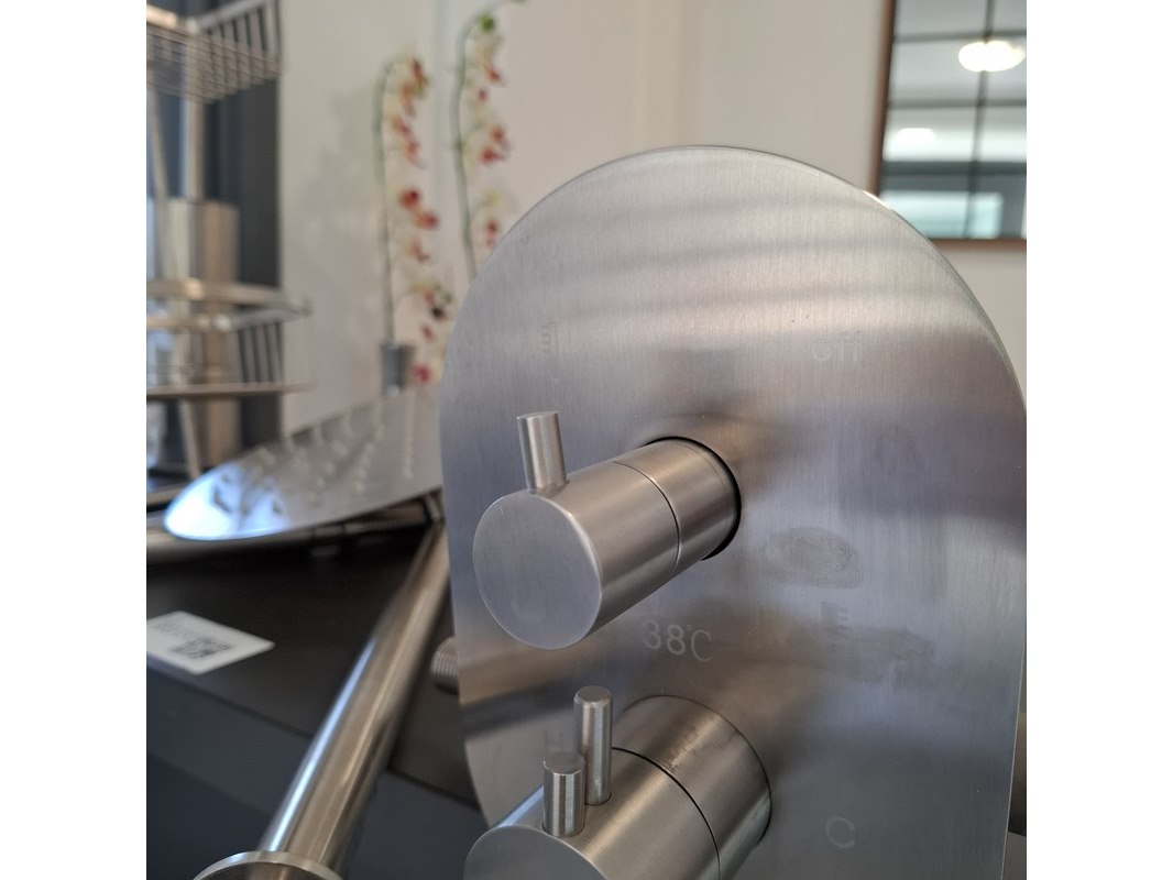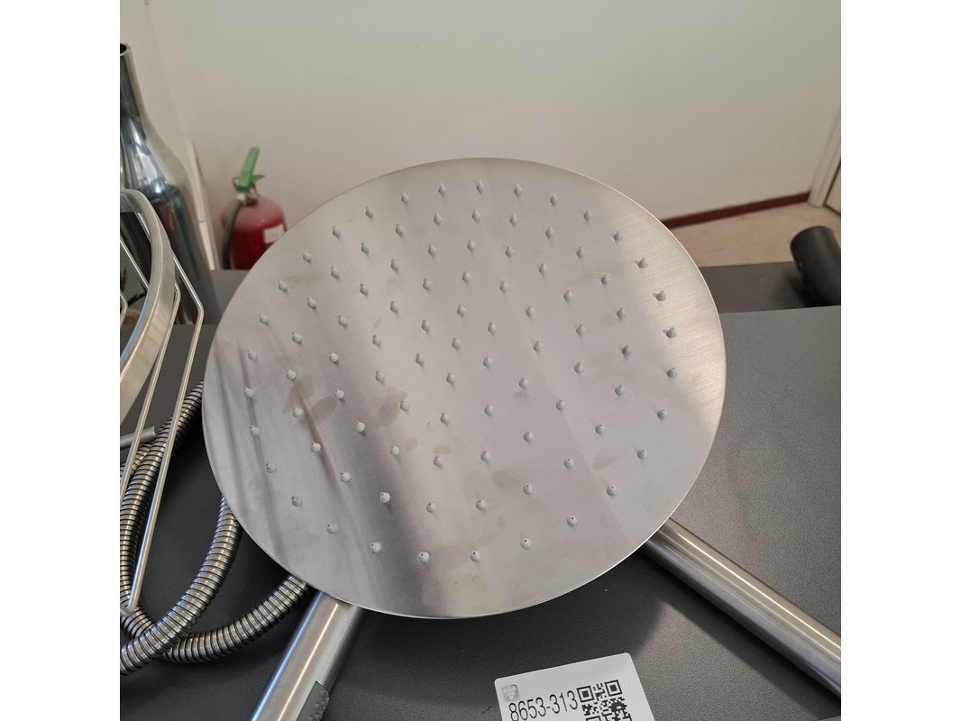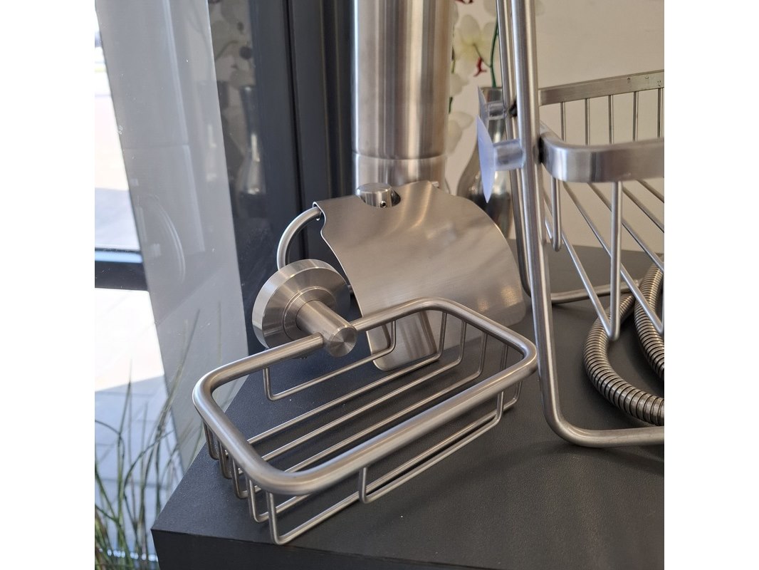Product: Regendoucheset Kleur: rvs geborsteld Specificaties: set: 1x thermostaatkraan, 1x regendouche, 300mm, 1x douchearm, 400mm, 1x handdouche, 1x handdouchehouder, doucheslang, 1xdoucherek, 1x zeephouder, 1x toiletrolhouder, 1x wc borstel