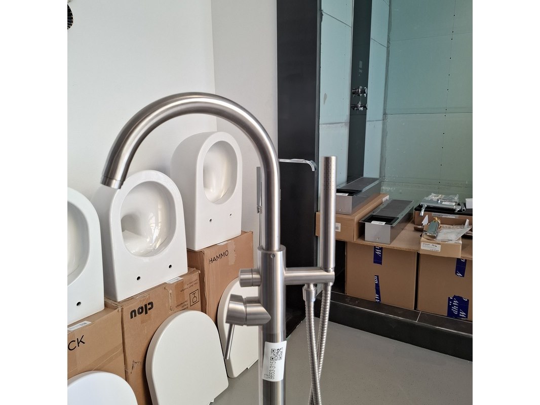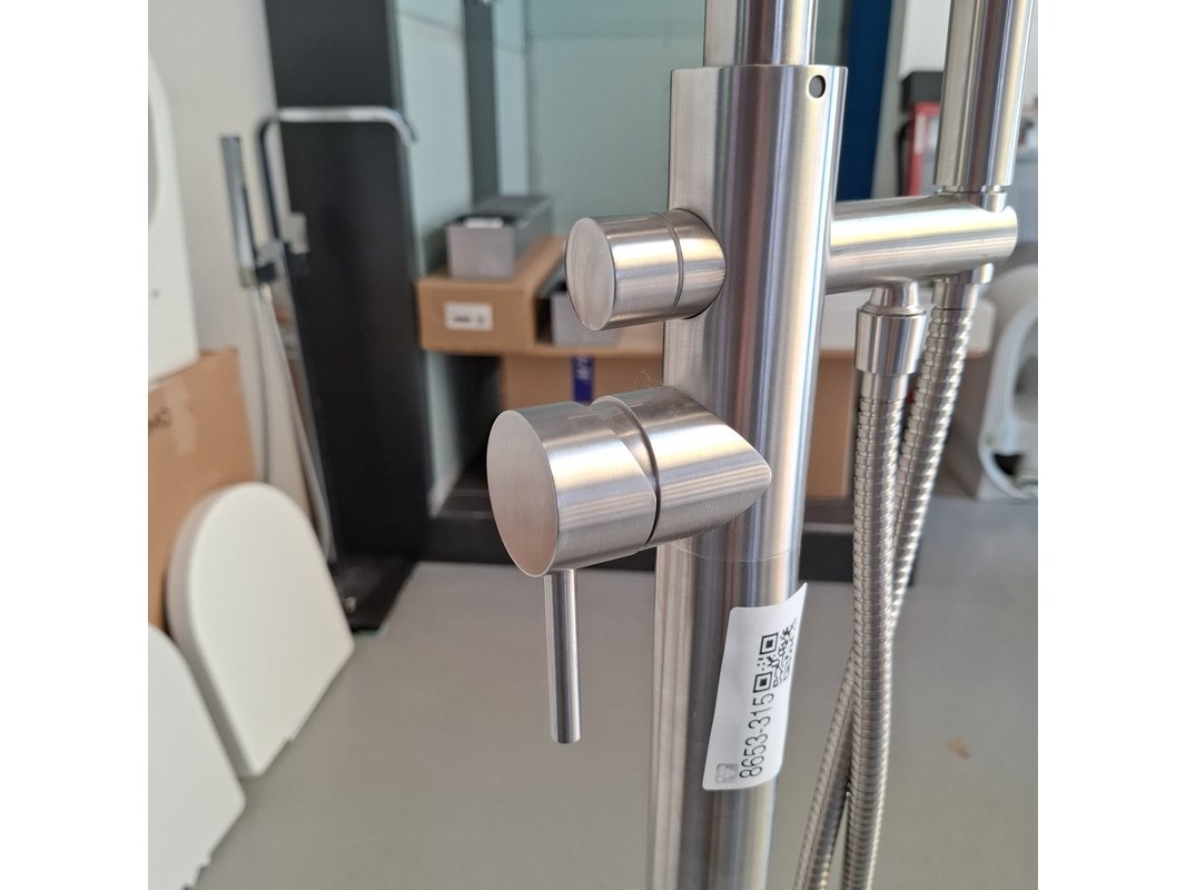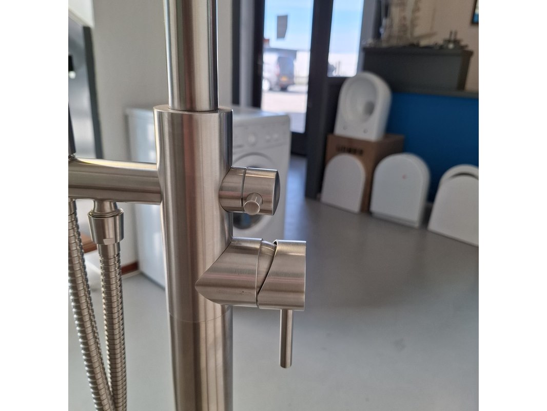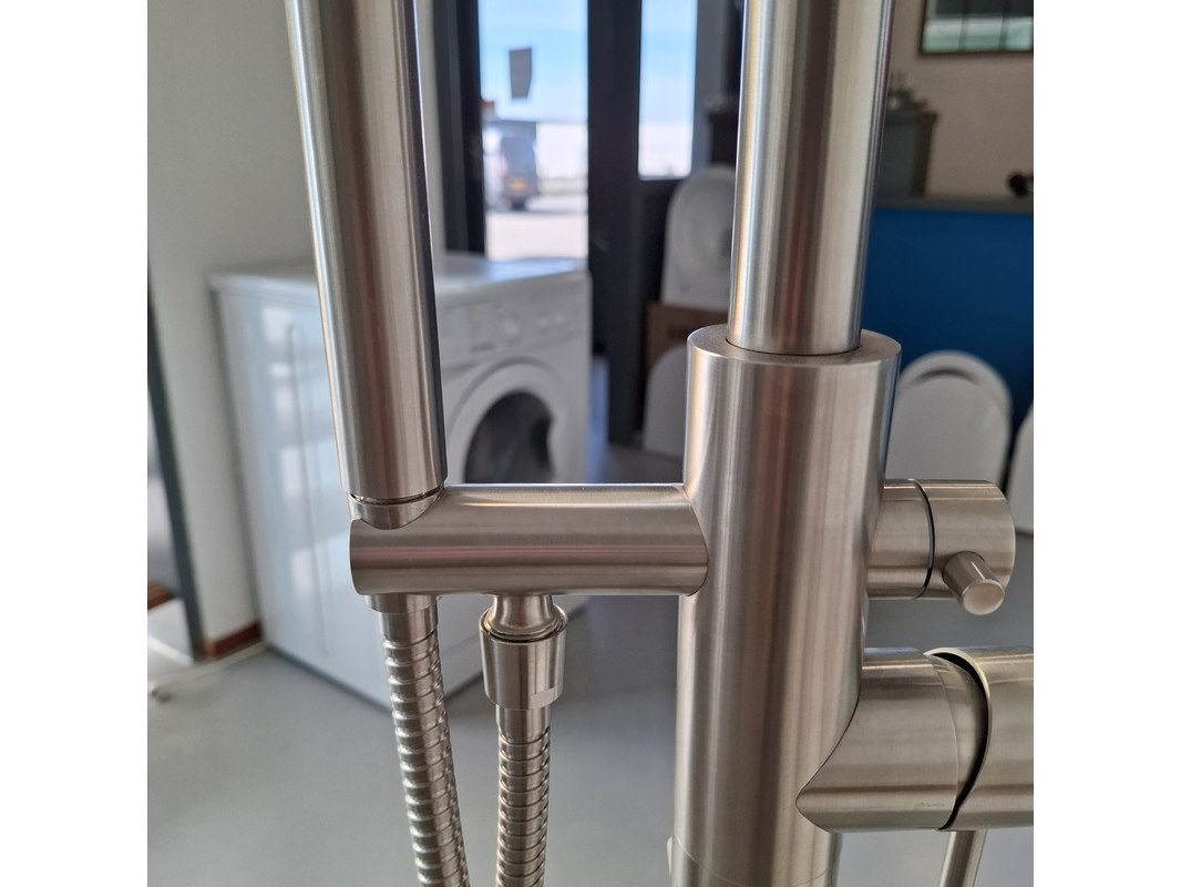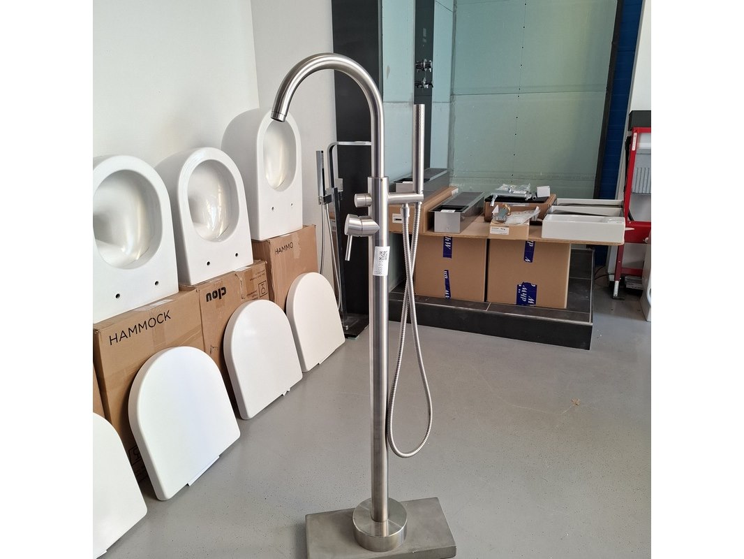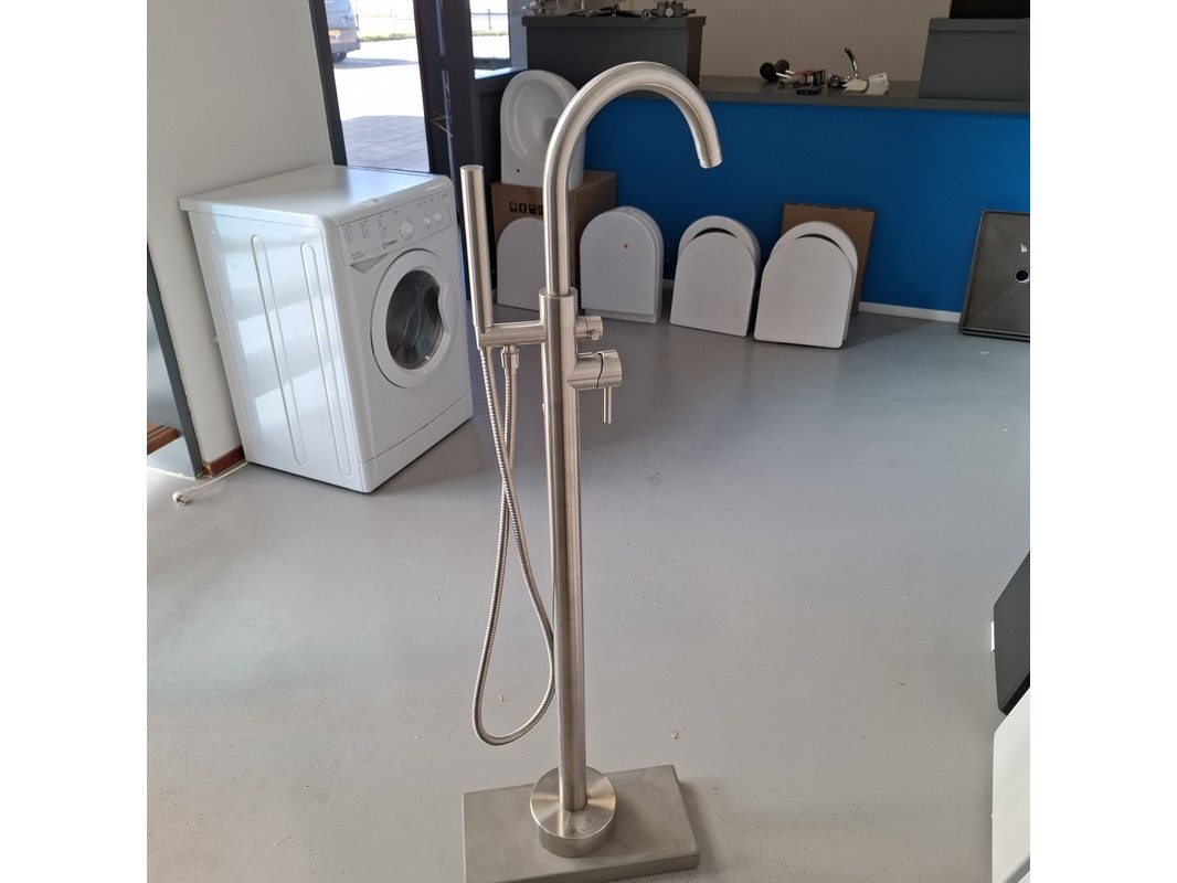 Product: Staande badkraan Kleur: rvs geborsteld Specificaties: mengkraan, met omstelling, handdoucheset