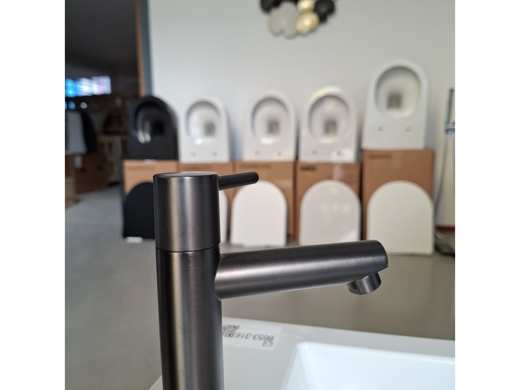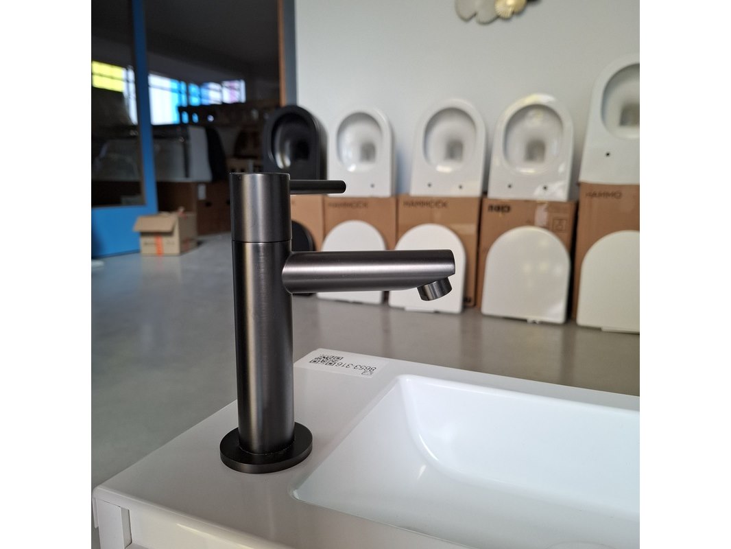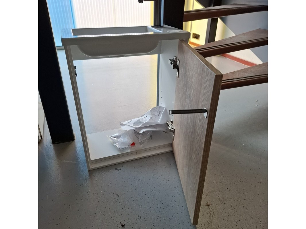 Product: Fonteinmeubel Kleur: eiken/wit Afmeting: 41x23cm Specificaties: met push open deurtje, polybeton fonteintje, fonteinkraan, gun metal