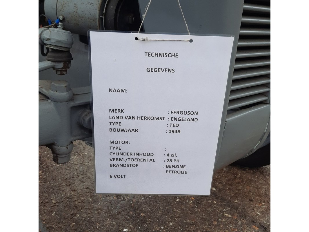 Merk: Ferguson Product: Oldtimer tractor BouwJaar: 1948 Specificaties: Motor: 4 cilinder, 28pk, benzine/petroleum 6 Volt accu