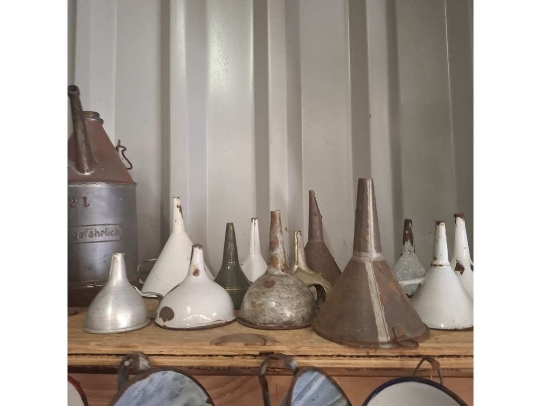 Diverse nostalgische schenkkanen en trechter