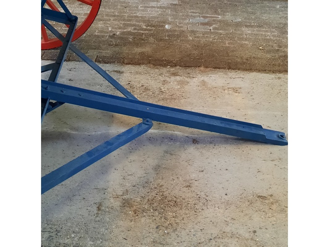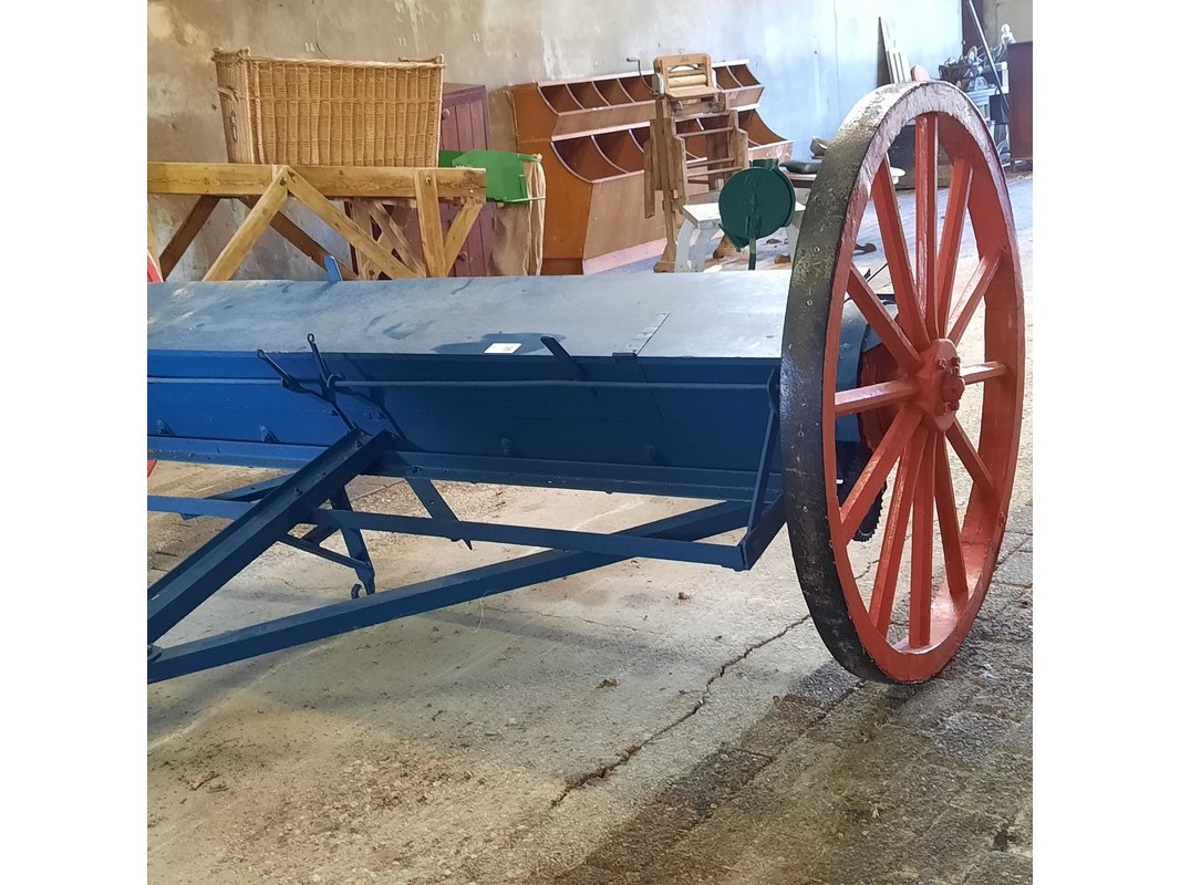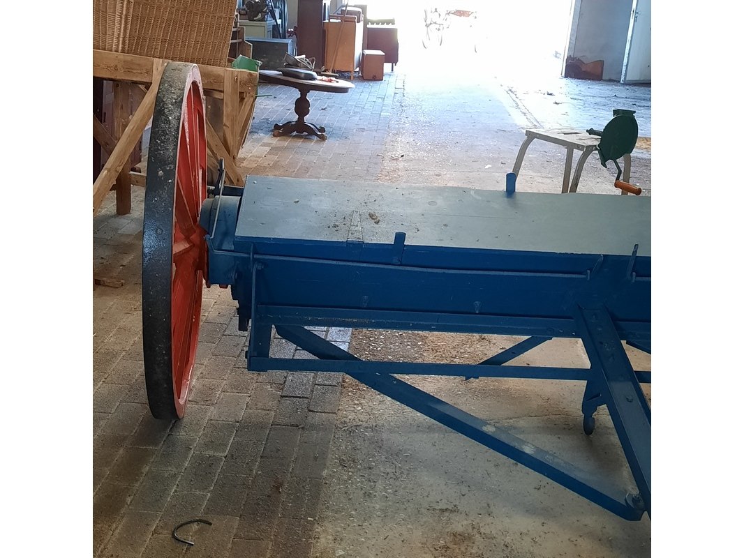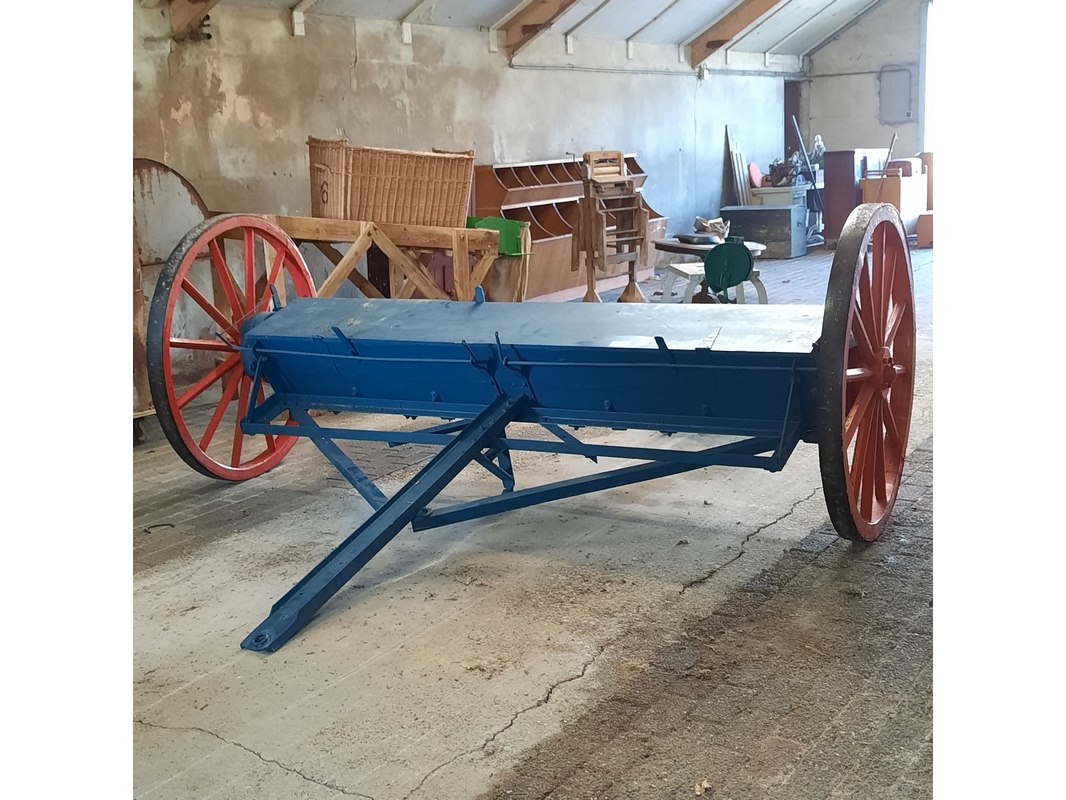 Product: Nostalgische kunstmeststrooier Afmeting: werkbreedte ca 232cm Specificaties: totale breedte ca 280cm