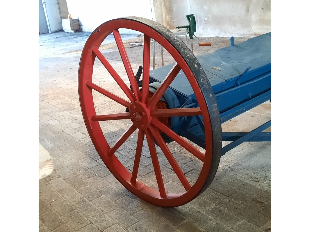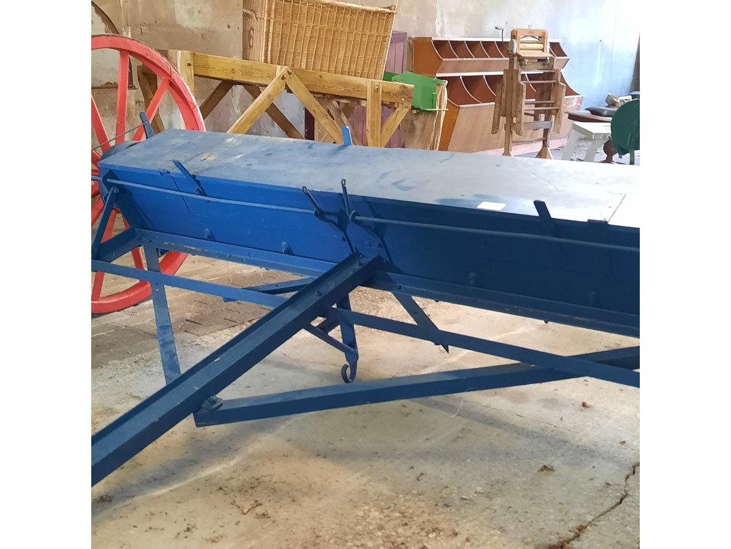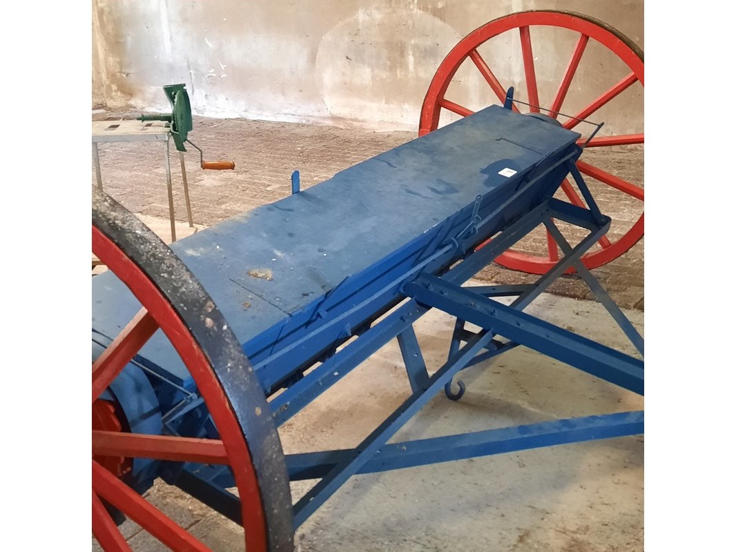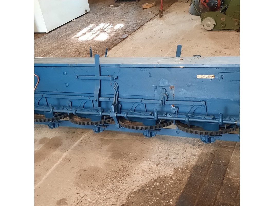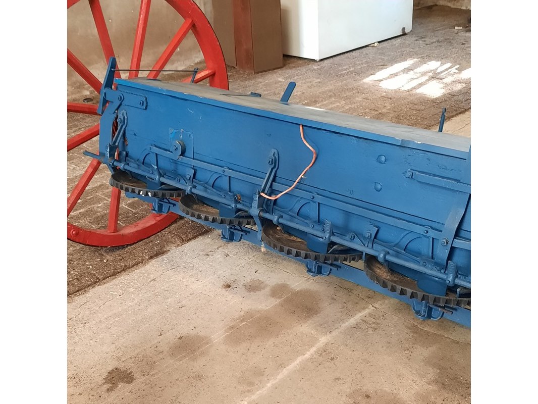 Product: Nostalgische kunstmeststrooier Afmeting: werkbreedte ca 232cm Specificaties: totale breedte ca 280cm