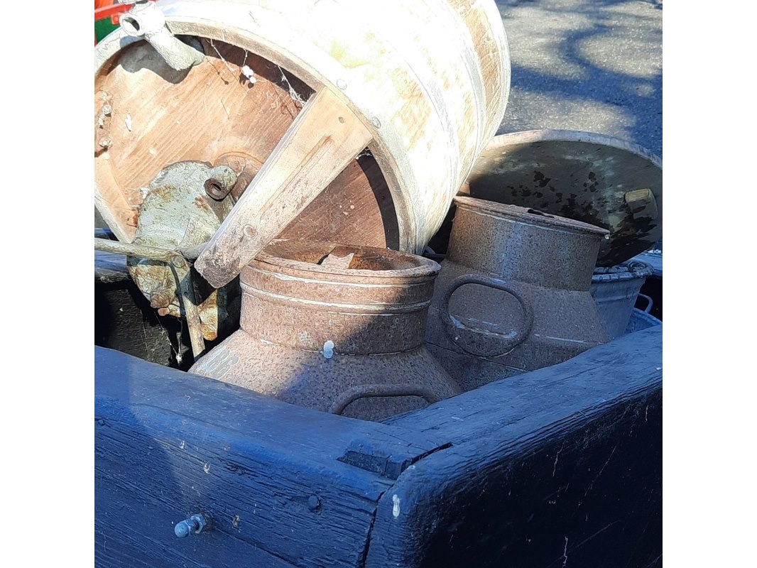 Product: Nostalgische melkwagen met 2x melkbus Afmeting: totale lxbxh ca 320x140x96cm Specificaties: incl. diverse toebehoren