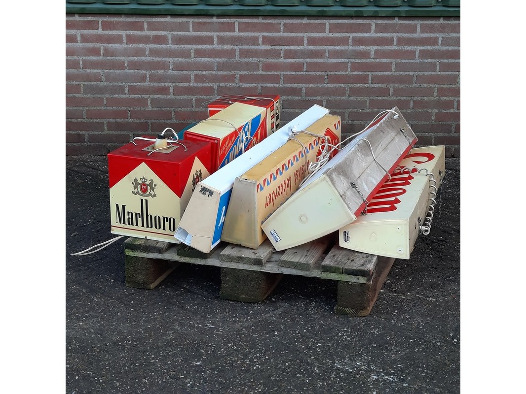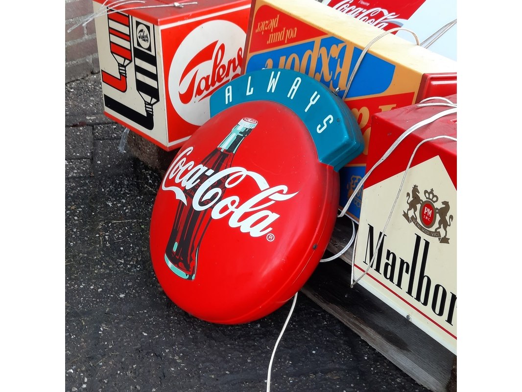 Product: 8x Nostalgische lichtreclame borden Specificaties: o.a. Malboro, Coca-Cola, Canon, etc
