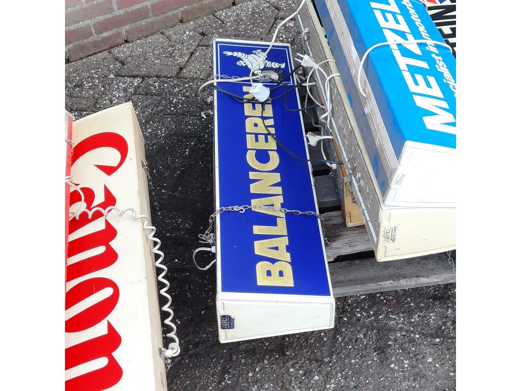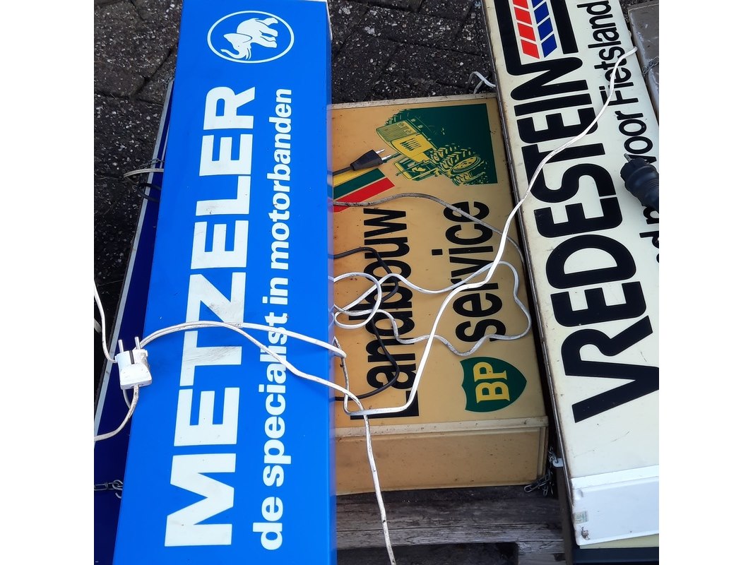 Product: Ca 11x nostalgische lichtreclame borden Specificaties: o.a. Kroon oil, Vredestein, Metzeler, etc
