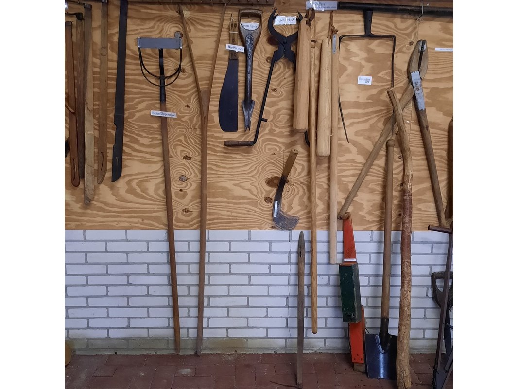 Product: Partij nostalgisch handgereedschap Specificaties: o.a. vlegels, zicht, pik en haargerei, bietenkoppensnijder, bietenmes, bietentrekker, disteltrekker, maispoter, etc.