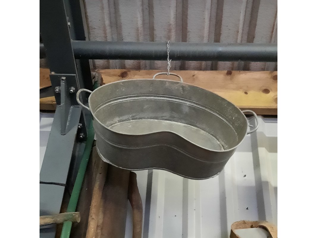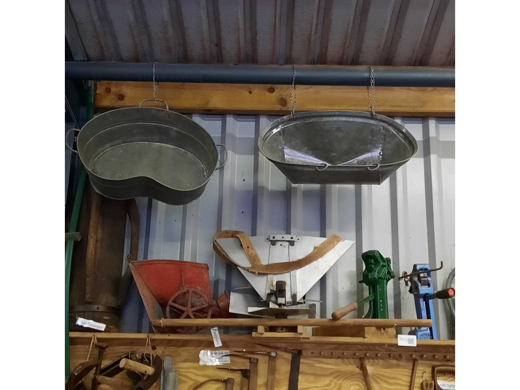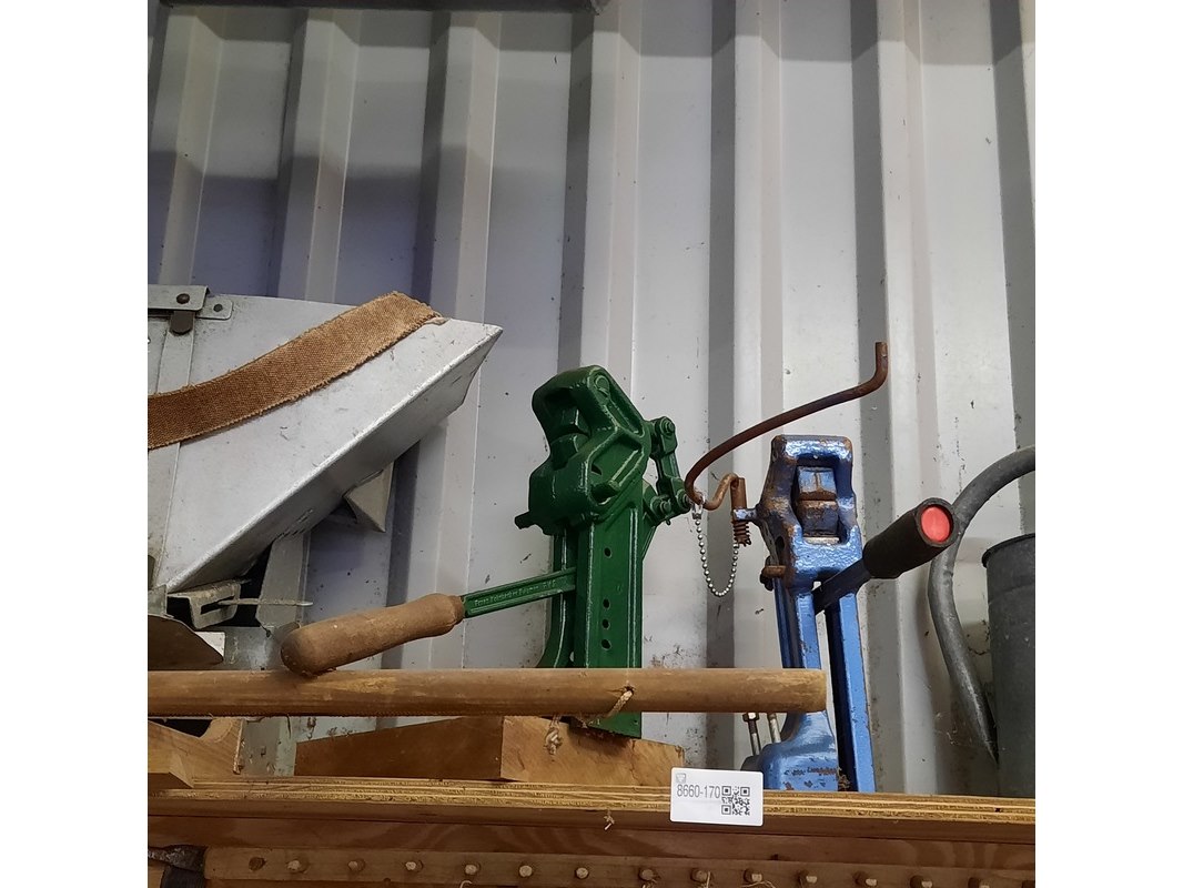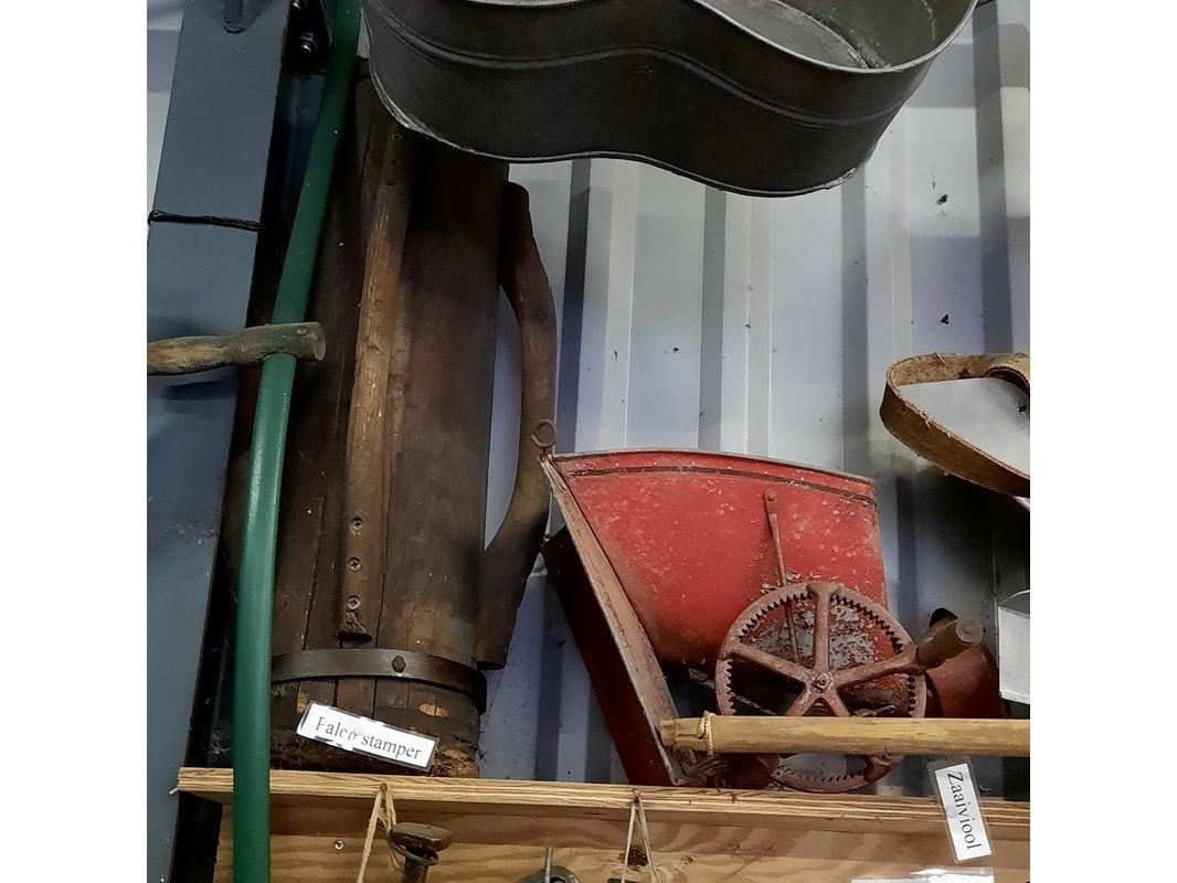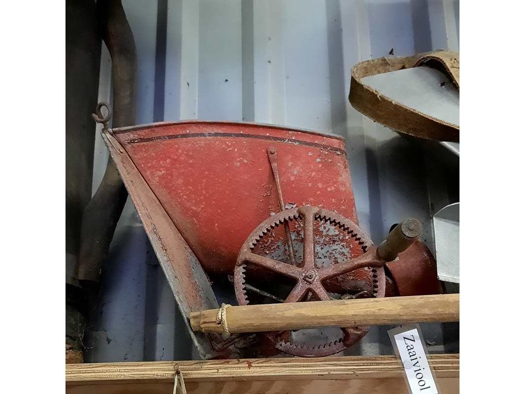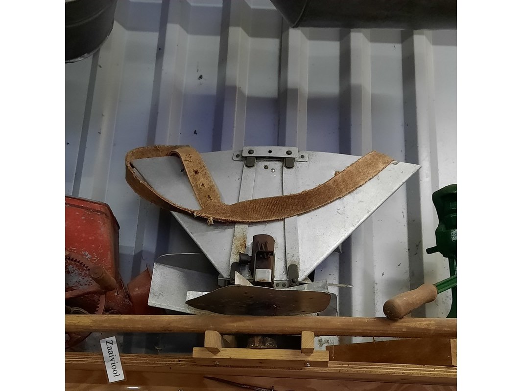 Product: 9x Nostalgische attributen Specificaties: o.a. palenstamper, 2x zeis, zaaiviool, 2x zinken zaaibak