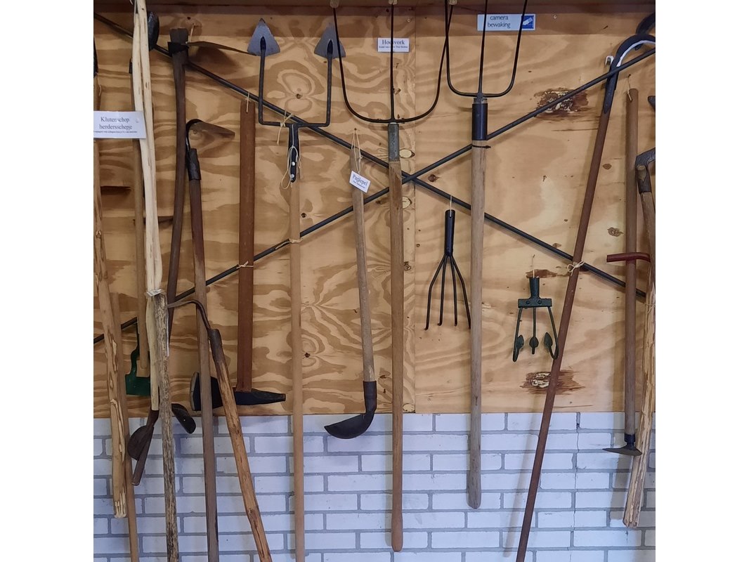 Product: Nostalgisch handgereedschap Specificaties: o.a. herder schepjes, stamper, hooivork, schoffels, plantenschop, aardappelgreep, etc.