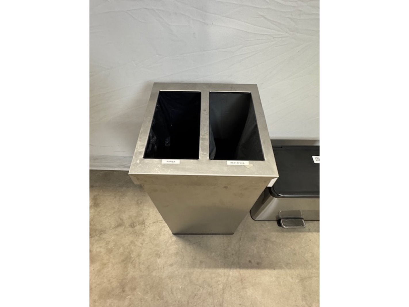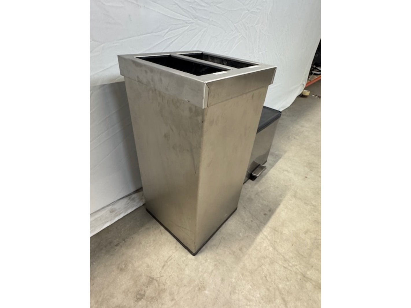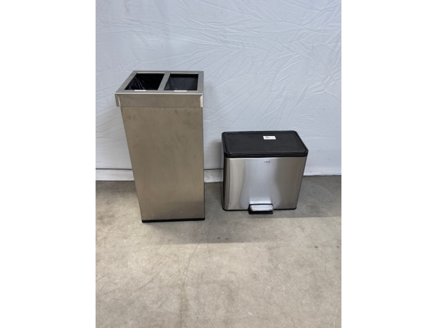 Merk: Eki en Carro Product: Afvalbak Materiaal: RVS Afmeting: bxdxh ca. 36x36x76cm en 46x27x42cm