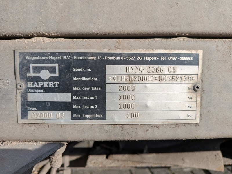 Merk: Hapert Product: Kipper aanhangwagen BouwJaar: 2001 Conditie: Gebruikt Specificaties: Basiskenmerken Kenteken: WD-PS-33 Goedkeuringsnummer: HAPA-2068 08 Identificatienummer: XLH*D20000*00652179 Datum eerste toelating: 14 december 2001 Maten & Gewichten Voertuig lengte: 4.170 mm Voertuig breedte: 1.710 mm Laadvloer (LxB) : ca. 2.700 x 1.600 mm Wielbasis: 750 mm Massa rijklaar: 570 kg Max. massa voertuig: 2.000 kg Laadvermogen: 1.430 kg
