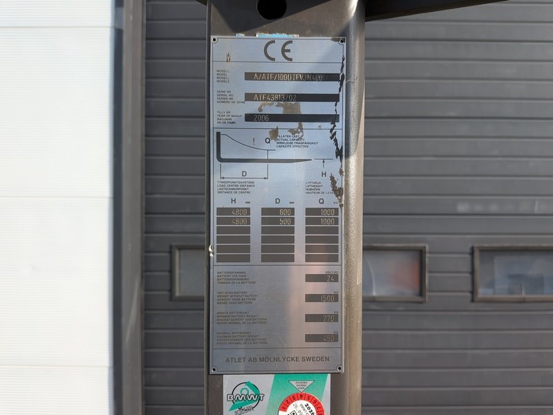 Merk: Atlet Product: (NS materiaal) Reachtruck BouwJaar: 2006 Conditie: Gebruikt Specificaties: Basiskenmerken Serienummer: ATF43813/02 Technische gegevens Batterijspanning: 24 V Gewicht (zonder batterij) : 1.500 kg Batterij gewicht: 270 / 450 kg Inclusief acculader