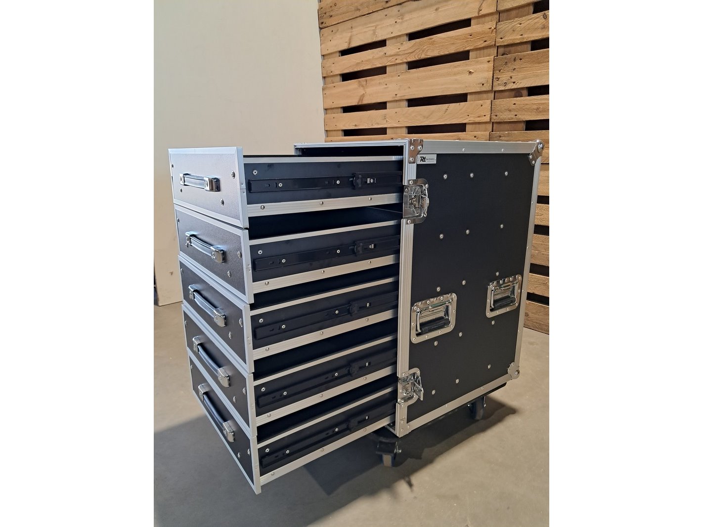 Merk: Power Dynamics Product: Flightcase met 5 lades en tafel Afmeting: LxBxH: 528 x 600 x 740 mm Conditie: Nieuw Specificaties: Maten & Gewichten Lengte (buiten) : 528 mm Breedte (buiten) : 600 mm Hoogte (buiten) : 740 mm Lengte (binnen) : 508 mm Breedte (binnen) : 580 mm Hoogte (binnen) : 720 mm Gewicht: 44,1 kg Voorzien van: • Vlindersloten • Verzonken handvaten • Ball corners • Afneembare deksel • 2x geremde wielen • 2x ongeremde wielen
