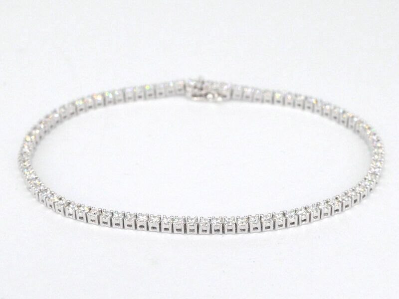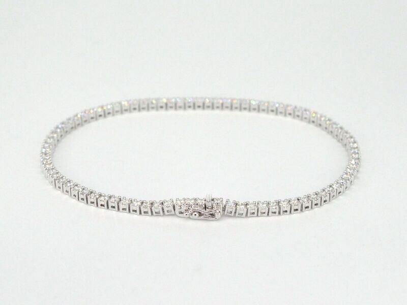Product: Witgouden tennisarmband met 3.00 carat diamanten Specificaties: Diamant: Natuurlijk Slijpvorm: Briljant geslepen Gewicht (carat): 3.00 carat Kleur: F-G Zuiverheid: VS Slijpkwaliteit: Excellent Juweel: Armband Gewicht: 8.8 gram Afmetingen/lengte: 17-18 cm Materiaal: 18K goud (750) Conditie: Nieuw Verpakking: Luxe sieradendoos Toelichting: De kwaliteit is overgenomen van het rapport behorend bij item. De waardebepaling is een beoordeling van een gecertificeerde diamantair, gebaseerd op consumentenprijzen. Consumentenprijs: € 16.293,-