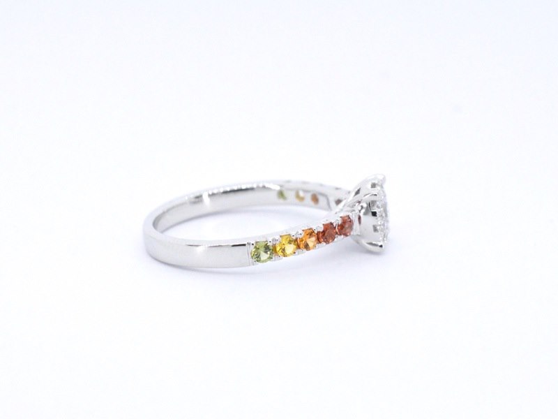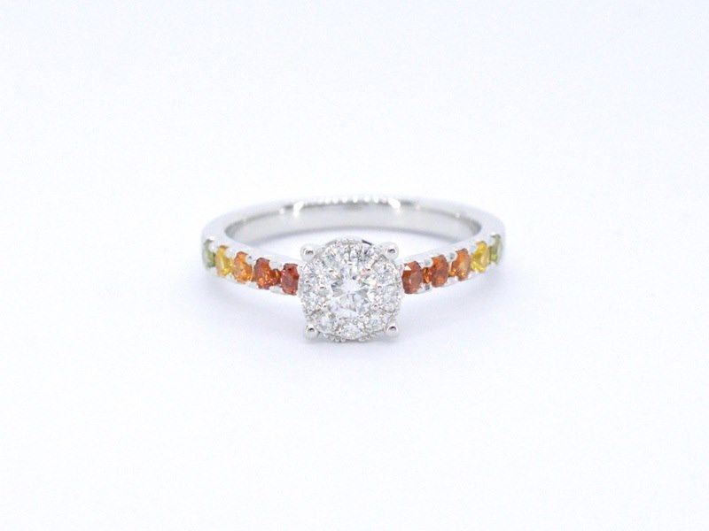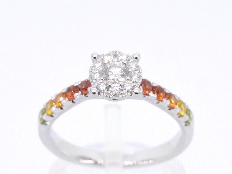 Product: Witgouden ring met diamanten en multicolour saffieren Specificaties: Diamant: Wit glanzend Slijpvorm: Briljant geslepen Gewicht (carat): 0.50 carat Kleur: F-G Zuiverheid: VS Slijpkwaliteit: Zeer mooi Edelsteen: Saffieren Aantal: 10 stuks Slijpvorm: Briljant geslepen Gewicht (carat): 0.50 carat Kleur: Multicolour Slijpkwaliteit: Very good Juweel: Ring Gewicht: 3.3 gram Ringmaat (op maat gemaakt*): 53 (17 mm) Materiaal: 18K goud (750) Conditie: Nieuw Verpakking: Luxe sieradendoos Toelichting: De kwaliteit is overgenomen van het rapport behorend bij item. De waardebepaling is een beoordeling van een gecertificeerde diamantair, gebaseerd op consumentenprijzen. Consumentenprijs: € 4.183,-