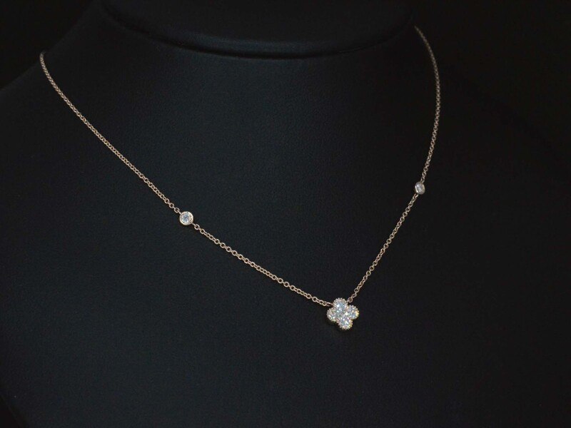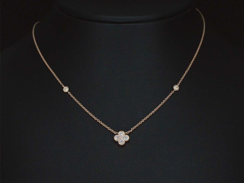 Product: Rosegouden collier met diamanten hangers klaver vier Specificaties: Diamant: Natuurlijk Aantal: 7 stuks Slijpvorm: Briljant geslepen Gewicht (carat): 0.30 carat Kleur: F-G Zuiverheid: VS Slijpkwaliteit: Zeer mooi Juweel: Collier Gewicht: 1.9 gram Afmetingen/lengte: 42 cm Materiaal: 18K goud (750) Conditie: Nieuw Verpakking: Luxe sieradendoos Toelichting: De kwaliteit is overgenomen van het rapport behorend bij item. De waardebepaling is een beoordeling van een gecertificeerde diamantair, gebaseerd op consumentenprijzen. Consumentenprijs: € 3.028,-