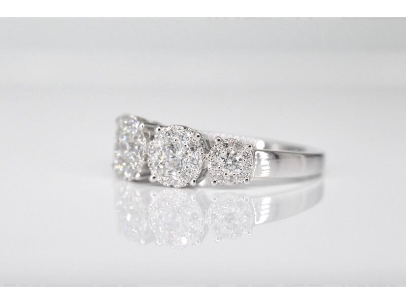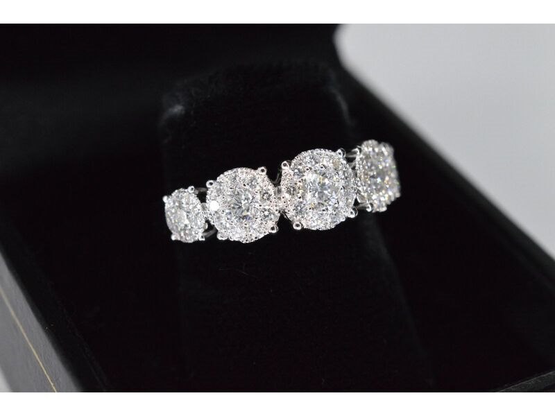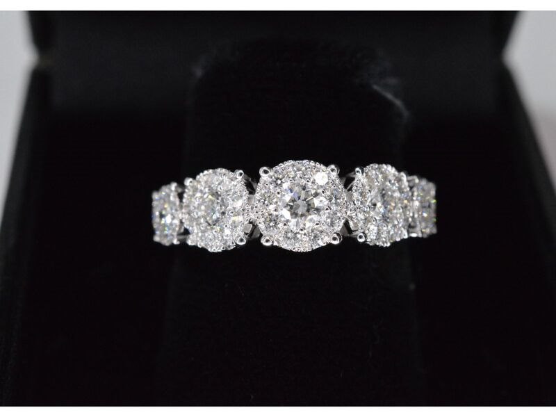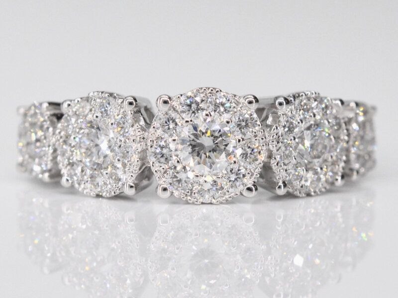 Product: Witgouden rijring met 5 diamanten entourages 1.00 carat Specificaties: Diamant: Natuurlijk Aantal: 5 entourages Slijpvorm: Briljant geslepen Gewicht (carat): 1.00 carat Kleur: F-G Zuiverheid: VS Slijpkwaliteit: Zeer mooi Juweel: Ring Gewicht: 4.3 gram Ringmaat (op maat gemaakt*): 53 (17 mm) Materiaal: 18K goud (750) Conditie: Nieuw Verpakking: Luxe sieradendoos Toelichting: De kwaliteit is overgenomen van het rapport behorend bij item. De waardebepaling is een beoordeling van een gecertificeerde diamantair, gebaseerd op consumentenprijzen. Consumentenprijs: € 7.228,-