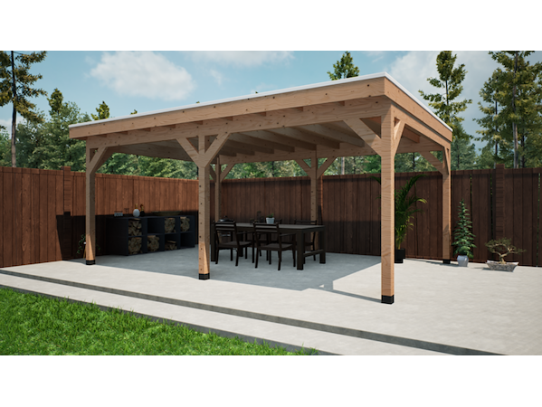 Merk: Verando Product: Douglas overkapping, 402 x 578 cm Materiaal: Douglas Conditie: nieuw Specificaties: De Verando Pure Douglas overkapping is een bouwpakket van fijn bezaagd Europees Douglas hout. Deze overkapping heeft een overstek. Het bouwpakket is al op maat gezaagd en wordt geleverd als een compleet pakket inclusief bevestigingsmaterialen en een duidelijke, stapsgewijze handleiding voor de montage. Het pakket bestaat uit: - Palen van 12 x 12 cm; - Een ringbalk van 5 x 15 cm; - Een balklaag van 5 x 15 cm; - Dakbeschot van 1,8 cm dik; - Boeiboorden van 2,2 x 20 cm; - Schoren van 5 x 15 cm; - Alle benodigde bevestigingsmaterialen; - Heldere en gebruiksvriendelijke montagehandleiding. De laatste afbeelding is ter illustratie van de houtkwaliteit.
