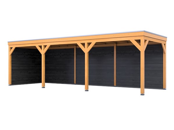 Merk: Verando Product: Douglas overkapping, 302 x 864 cm + wanden zwart, Materiaal: Douglas Conditie: nieuw Specificaties: De Verando Origin Douglas overkapping is een bouwpakket van fijn bezaagd Europees Douglas hout. Het bouwpakket is al op maat gezaagd en wordt geleverd als een compleet pakket inclusief bevestigingsmaterialen en een duidelijke, stapsgewijze handleiding voor de montage. Het pakket bestaat uit: - Palen van 12 x 12 cm; - Een ringbalk van 5 x 15 cm; - Een balklaag van 5 x 15 cm; - Dakbeschot van 1,8 cm dik; - Boeiboorden van 2,2 x 20 cm; - Schoren van 5 x 15 cm; - Zij- en achterwand van zwart Douglas Zweeds rabat; - Alle benodigde bevestigingsmaterialen; - Heldere en gebruiksvriendelijke montagehandleiding. De laatste afbeelding is ter illustratie van de houtkwaliteit.