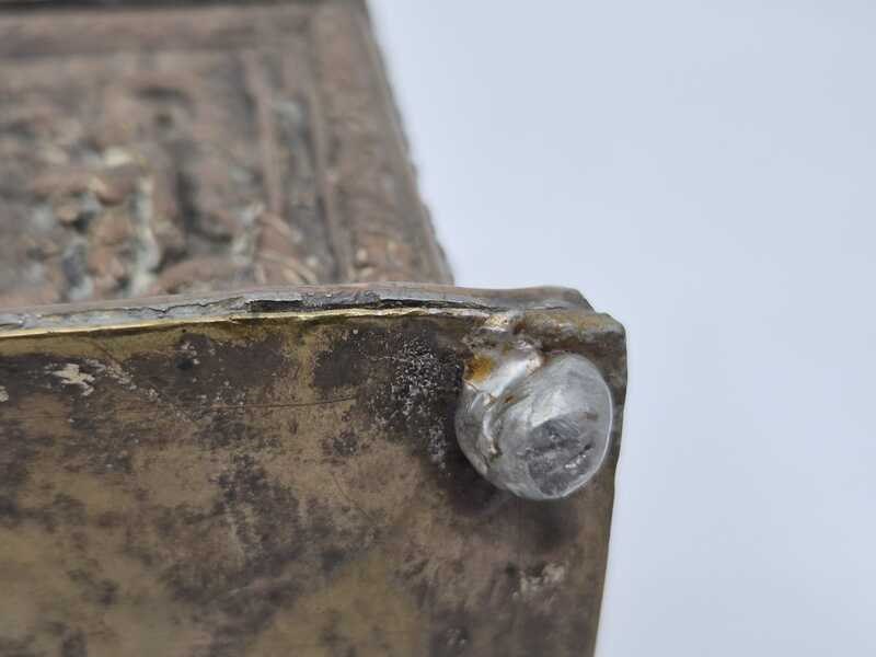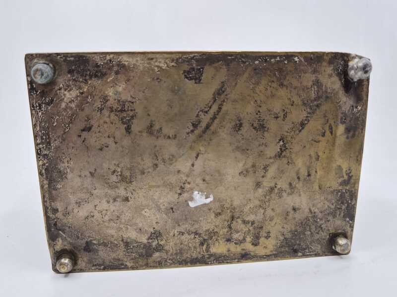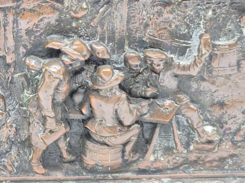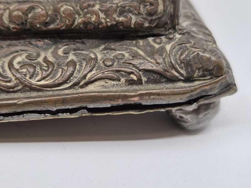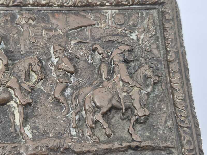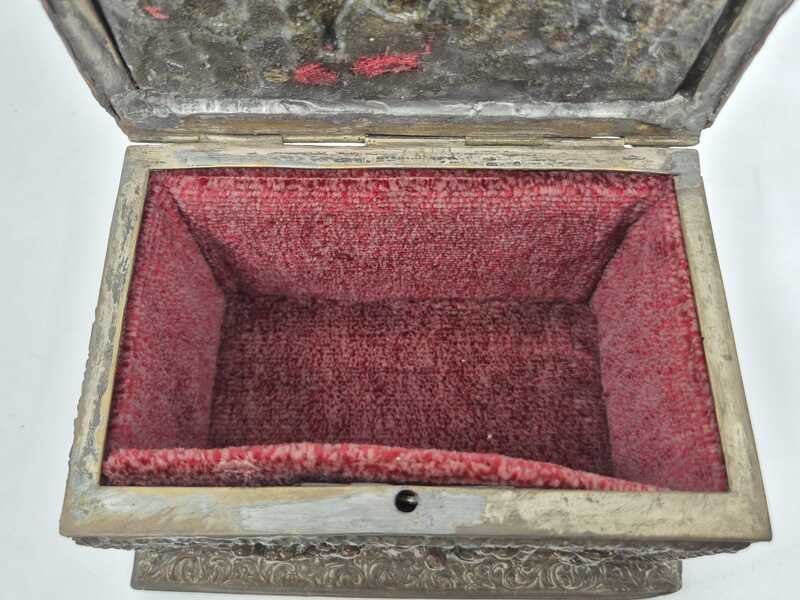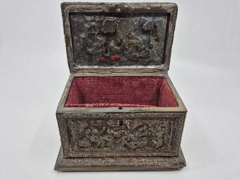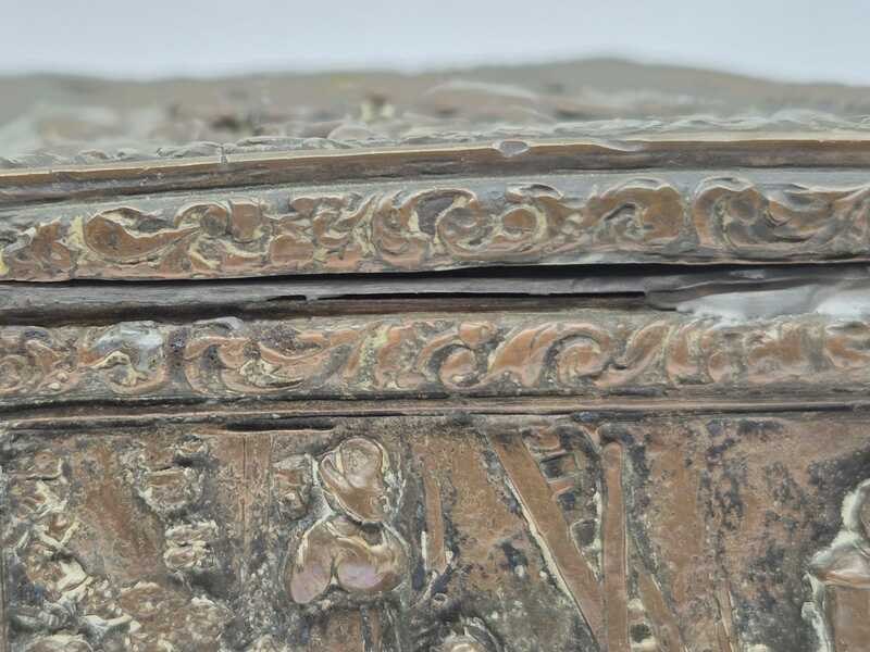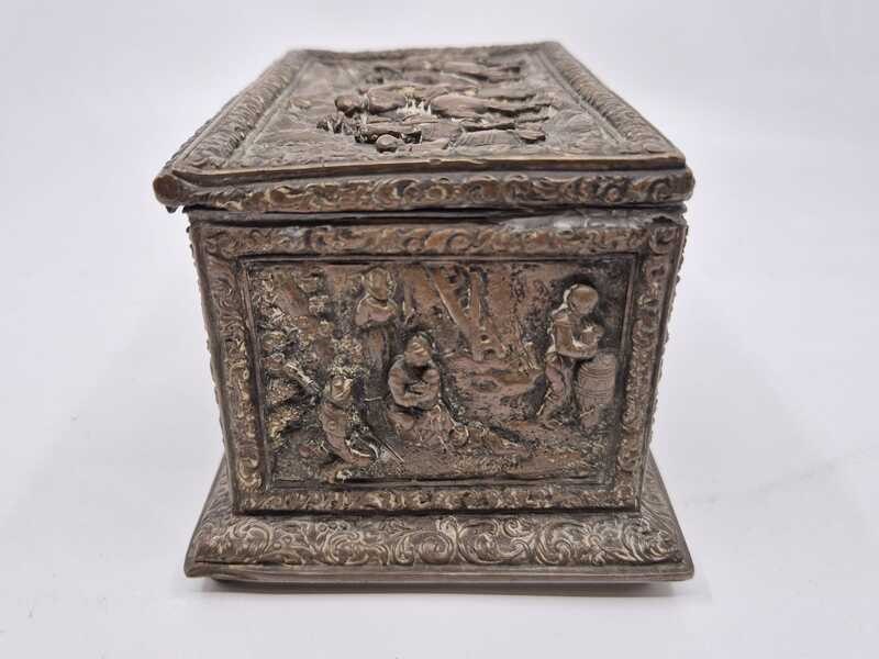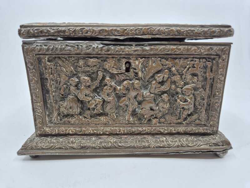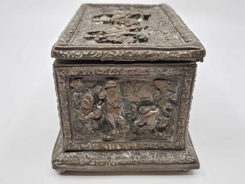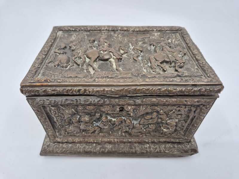 Product: Metalen sierkistje Specificaties: Decoratief rechthoekig sierkistje/opbergkistje uitgevoerd in metaal. Het kistje is rondom en op de deksel rijk voorzien van reliëfdecoraties met figuratieve taferelen en een ornamentale randafwerking. Het oppervlak vertoont patina en gebruikssporen passend bij leeftijd en gebruik. Sleutel ontbreekt Conditie: zie foto’s