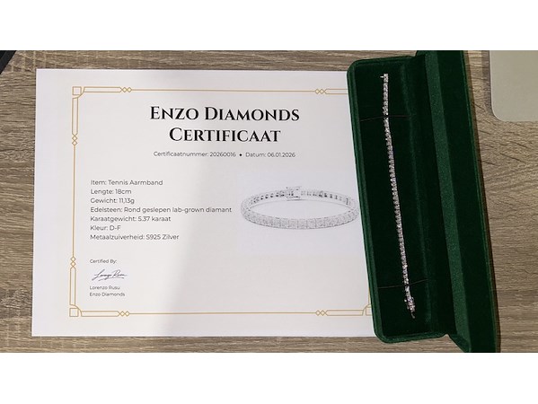 Product: Tennis armband met 5.37ct diamant Specificaties: Lab-grown Diamond report Slijpvorm: Round Brilliant Gewicht Diamant (carat): 5.37ct, 52x 3mm Kleur: D-F Zuiverheid: VS-VVS Fluoresence: None Juweel: Armbanden Gewicht: approx. 11,13g Materiaal: (925) Zilver Lengte: 18cm Conditie: Nieuw Verpakking: Luxe sieradendoos, certificaat. Klassieke elegantie, tijdloze schittering. Perfecte harmonie en verfijnde schittering. Deze tennisketting van 5,37 karaat, bezet met 3 mm diamanten, is de belichaming van ware elegantie. De fonkelende stenen zijn zorgvuldig gezet in een sterling zilveren montuur, wat zorgt voor een tijdloze glans en een verfijnde, stijlvolle uitstraling. Een prachtige keuze voor dagelijks gebruik of speciale gelegenheden – ingetogen luxe op zijn best.