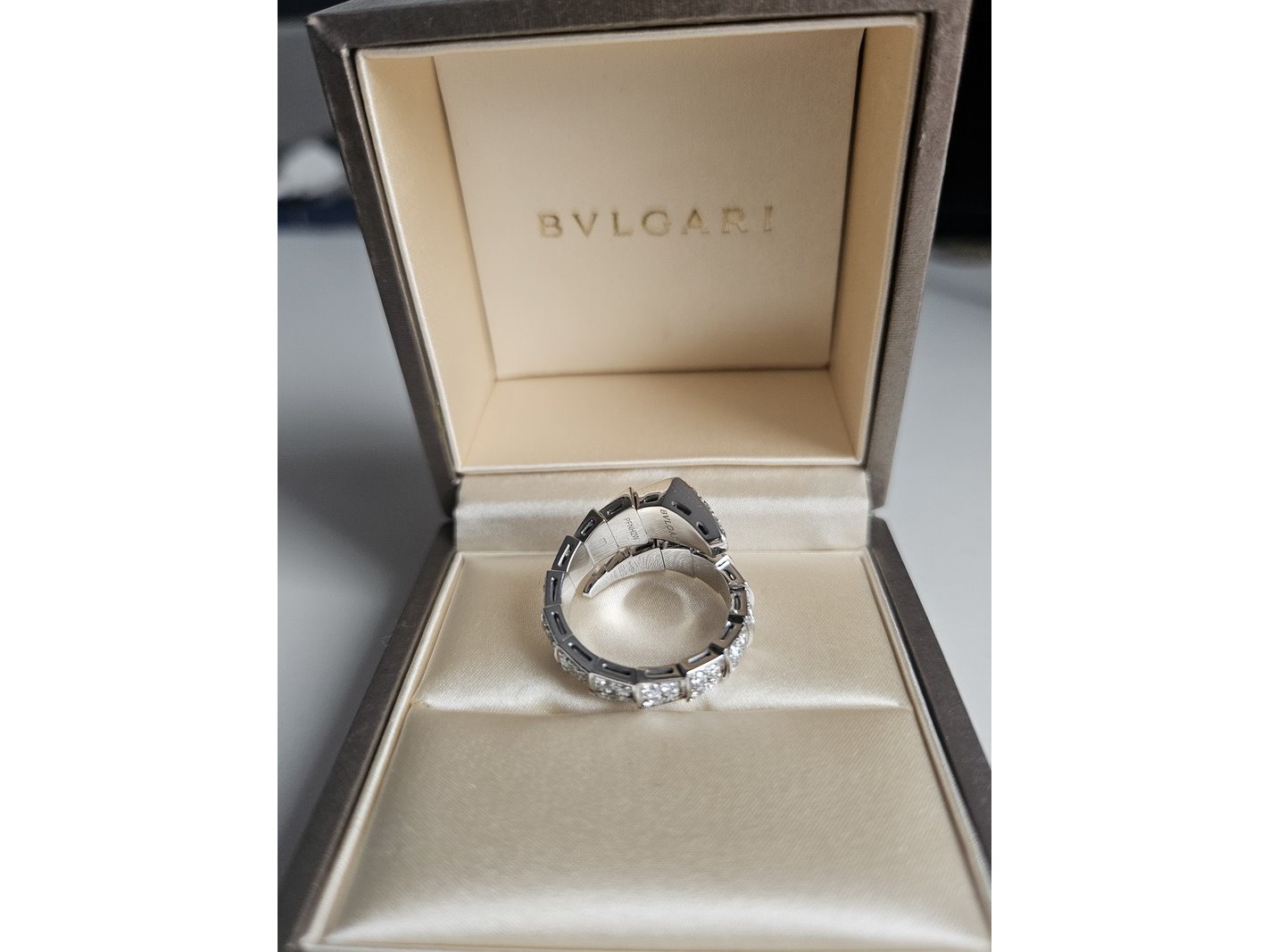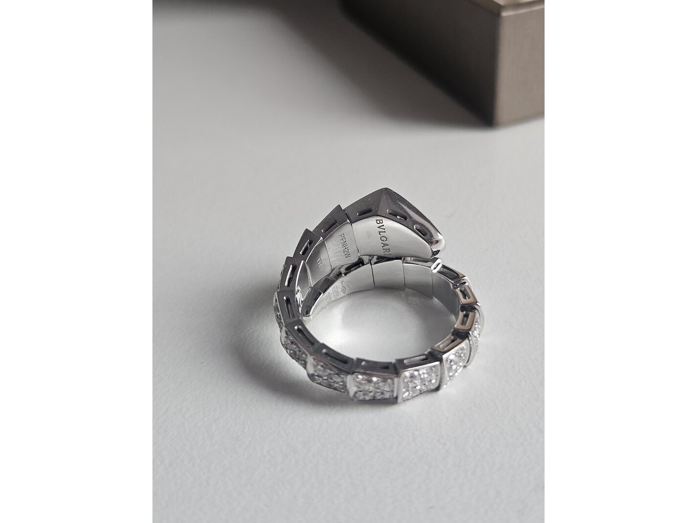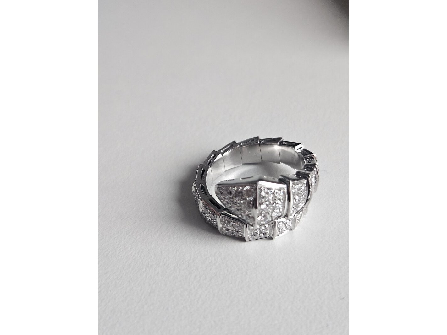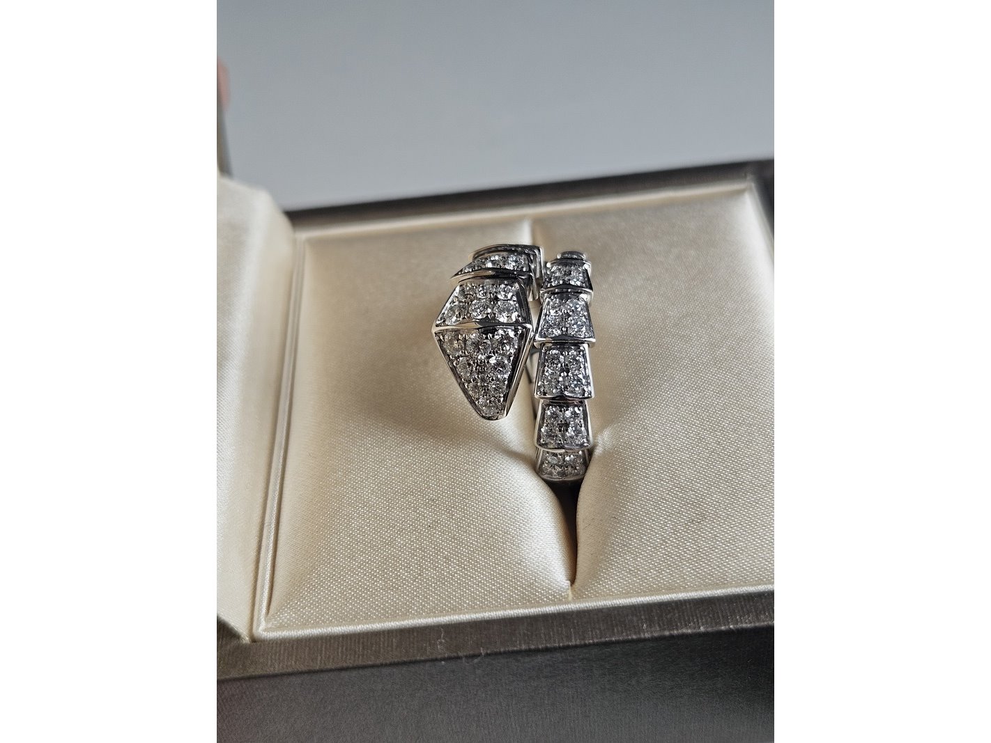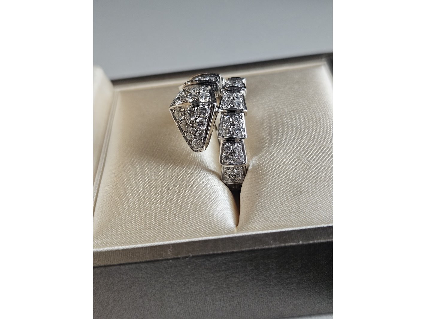 Merk: BVLGARI Product: Ring Materiaal: Goud/diamant Afmeting: M Conditie: Gebruikt Specificaties: Exclusieve 18 karaat witgouden pavé ring in Serpenti-stijl, volledig bezet met briljant geslepen diamanten. Het elegante, golvende ontwerp met dubbele band zorgt voor een krachtige en luxueuze uitstraling. De diamanten zijn pavé gezet voor maximale schittering en vuur. Ringmaat: M Materiaal: 18K witgoud Bezetting: Briljant geslepen diamanten (volledig pavé)