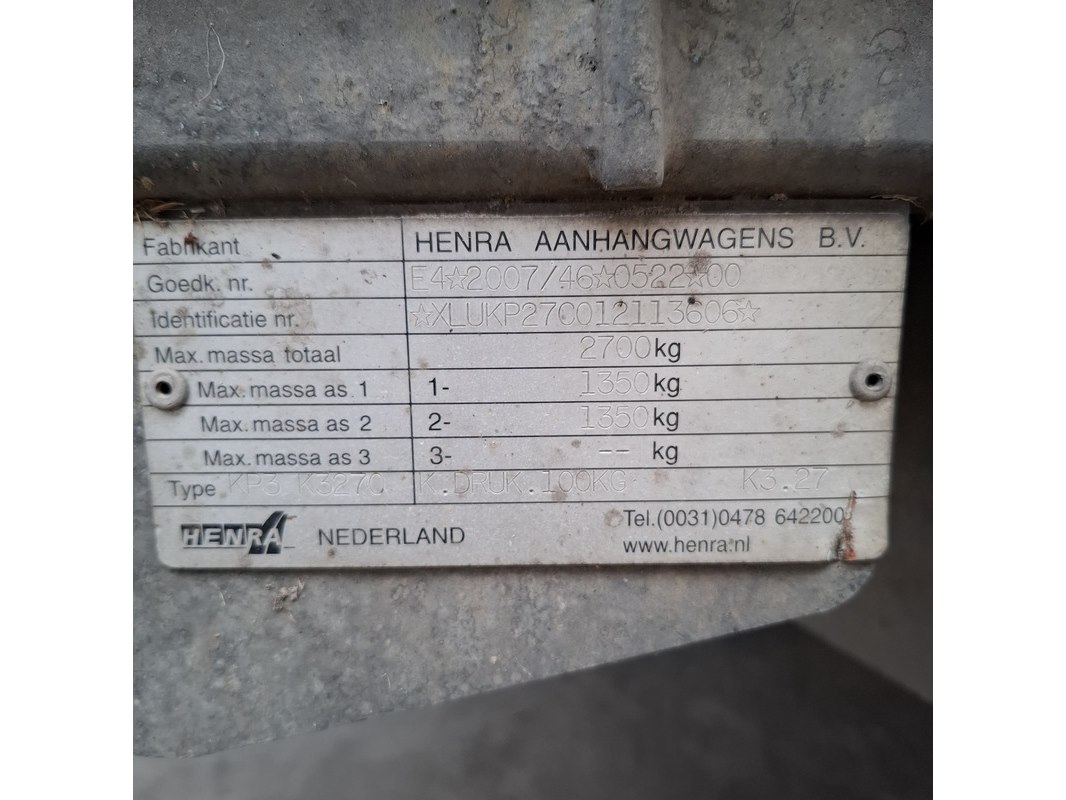 Merk: Henra Product: Geremde aanhanger Conditie: gebruikt Specificaties: Kenteken: 63-WJ-PH Eerste toelating nationaal: 22-09-2012 VIN nummer: XLUKP27C012113606 Waargenomen gebreken Diverse beschadigingen rondom