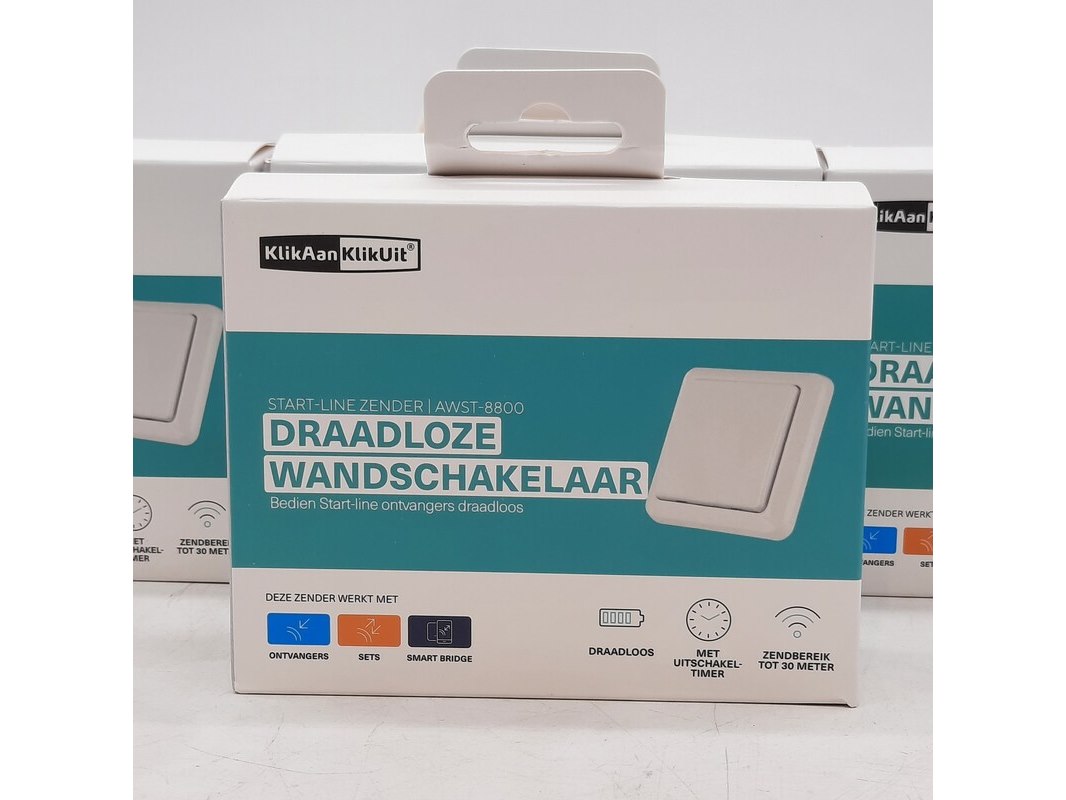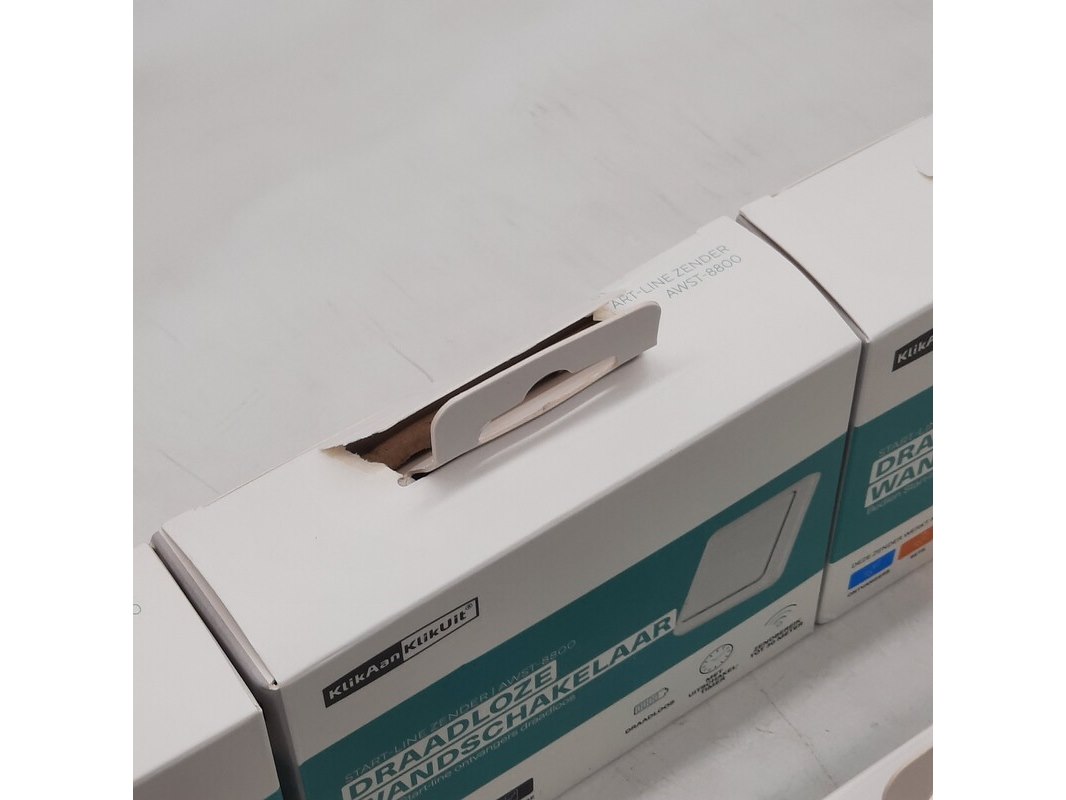 Merk: KlikaanKlikuit Product: Draadloze wandschakelaar Specificaties: 1x doosje beschadigd