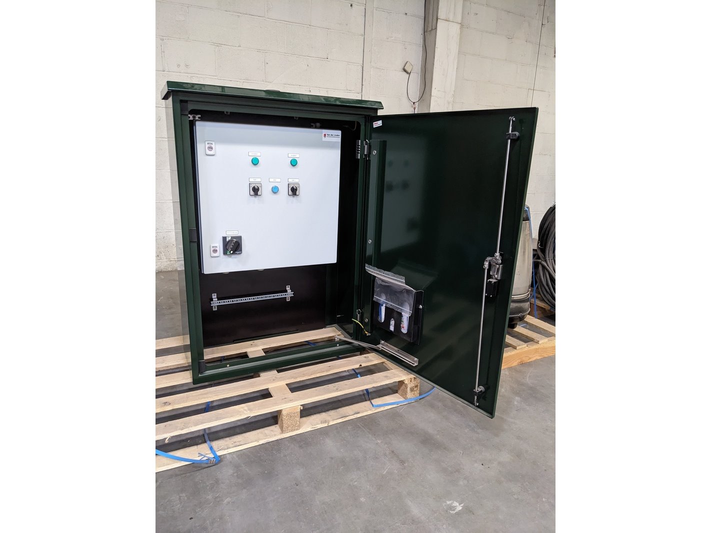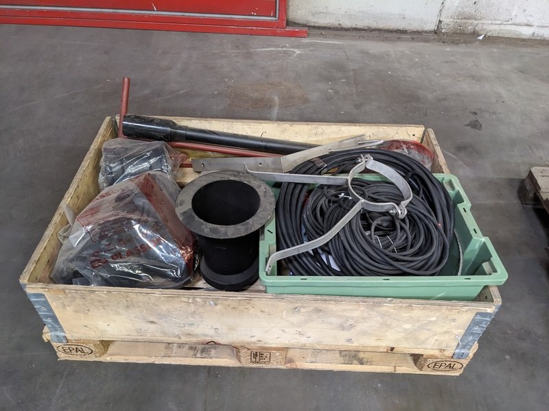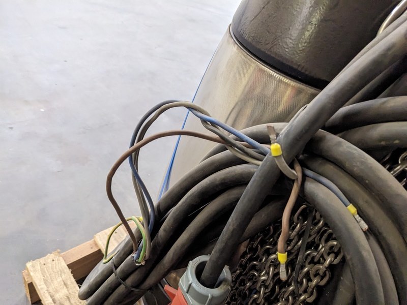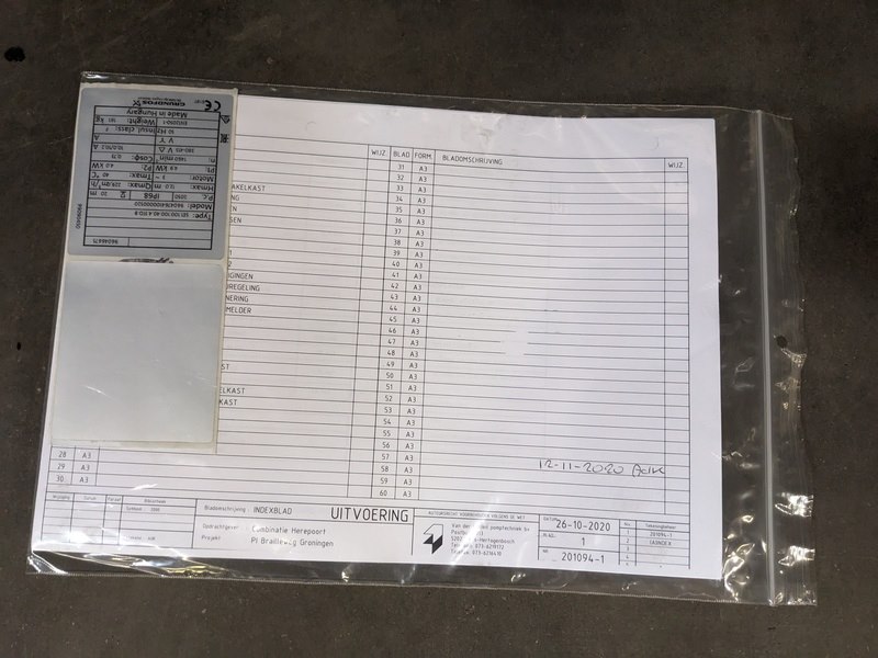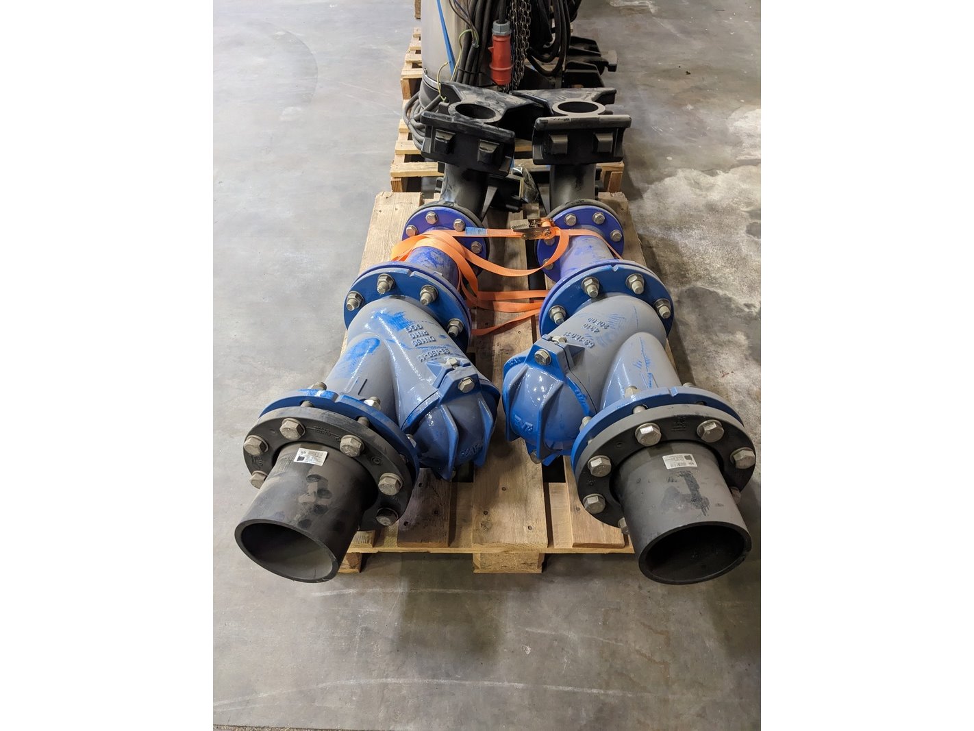 Merk: Grundfos Product: Pomp installatie met schakelkast t.b.v. Infra project Conditie: nieuw Specificaties: Kavel bestaat uit: 2x Pomp Grundfos SE1.100.100.40.4.51D.B. 4kW SDS 2x Ophangkoord 12-25mm tbv pompkabels 2x Voetbocht Grundfos DN100 2x FFRe-stuk DN100/150 2x Balkeerklep DN150 3x Overschuifflens Ø160mm/DN150 3x Voorlaskraag Ø160mm 3x Elektrolas mof Ø160mm 2x Buis Ø160mm SDR17 lg .= ca. 2800mm 1x Elektrolas knie Ø160mm 1x Buis Ø160mm SDR17 lg .= ca.700mm 1x Elektrolas T-stuk Ø160mm 1x FFM-stuk DN150 lg .= 500mm 1x Afsluiter DN150 1x Verlengspindel incl. IBG g.d .= 1570mm 1x Bedieningssleutel t.b.v. afsluiter 1x FFR-stuk DN150/DN200 1x Overgangskoppeling DN200/Ø200mm HDPE trekvast 1x Contragewicht Van der Lindenpomptechniek 1x Staalkabel Ø6mm lg .= 5500mm 3x Vlotter Zie de technische specificaties elektro 4x Kettinghaak Van der Lindenpomptechniek 2x Hijsketting 500KG lg .= 7000mm vzv overname ogen 4x Geleidebuis 2" lg .= 5300mm 2x Geleidebuishouder Grundfos 2" 1x Fundatie Wordt bepaald na engineer electro 2x Muurbeugel Ø160mm w.a .= 320mm zie tekening 1x StraatpotVan der Lindenpomptechniek