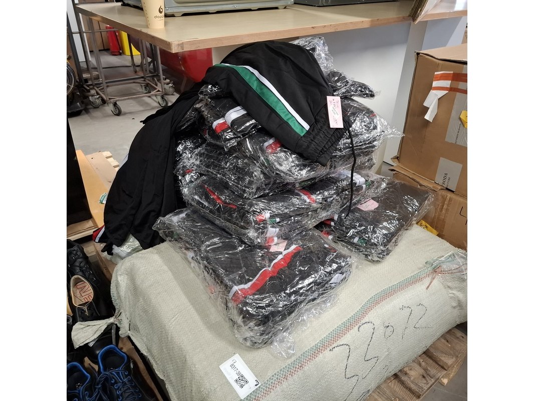 Product: Dames sportbroeken Kleur: Zwart Afmeting: 3 verschillende maten. Conditie: Nieuw Specificaties: 288 stuks trainingsbroeken sportbroeken dames zwart met band wit rood of groen nieuw