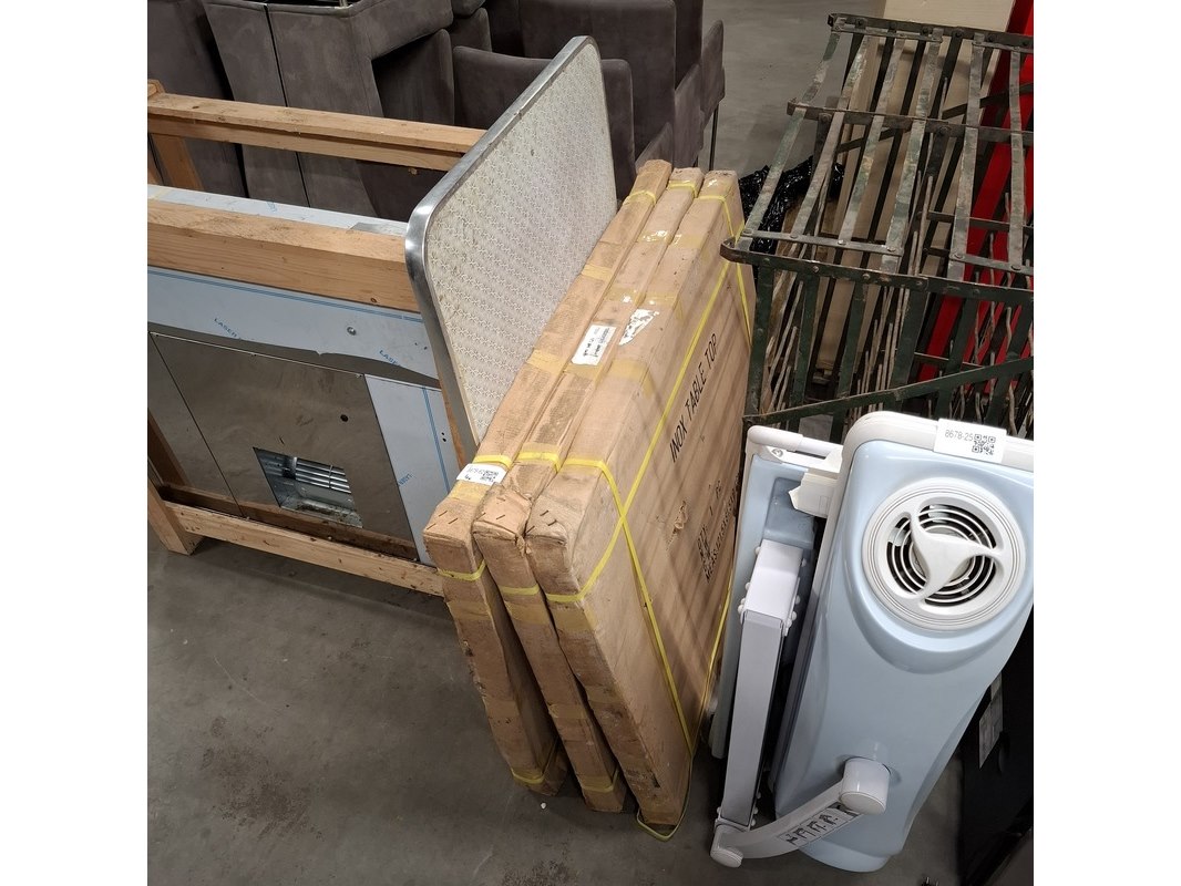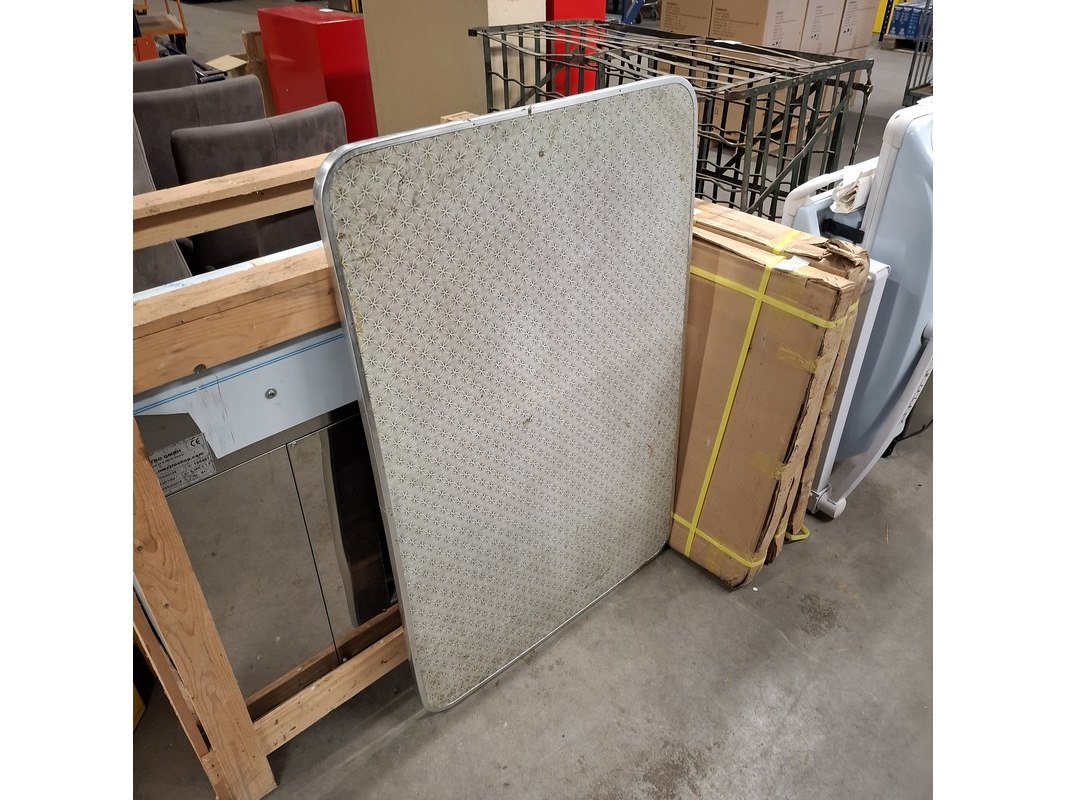 Product: Terras tafelbladen Materiaal: Pershout, aluminium bovenkant Afmeting: 86x120 Conditie: Gebruikt Specificaties: 1x licht beschadigd 3x nieuw in doos maar doos beschadigd