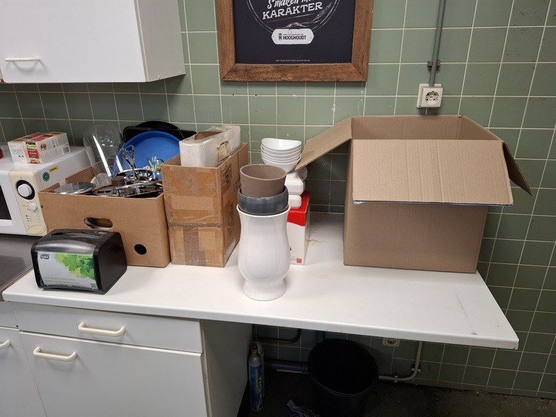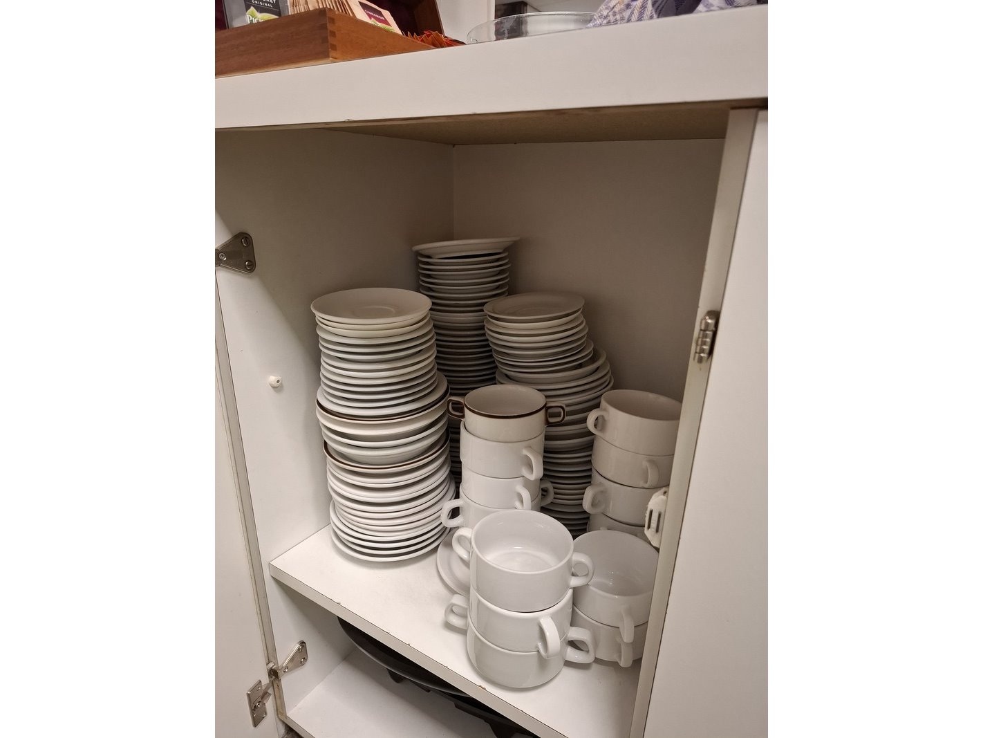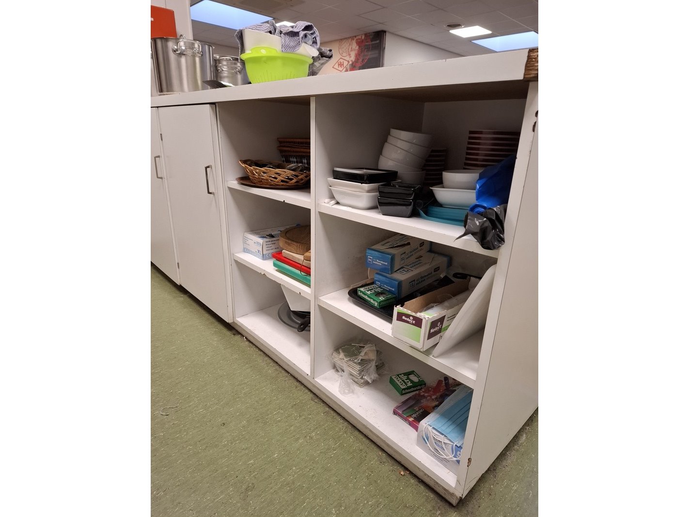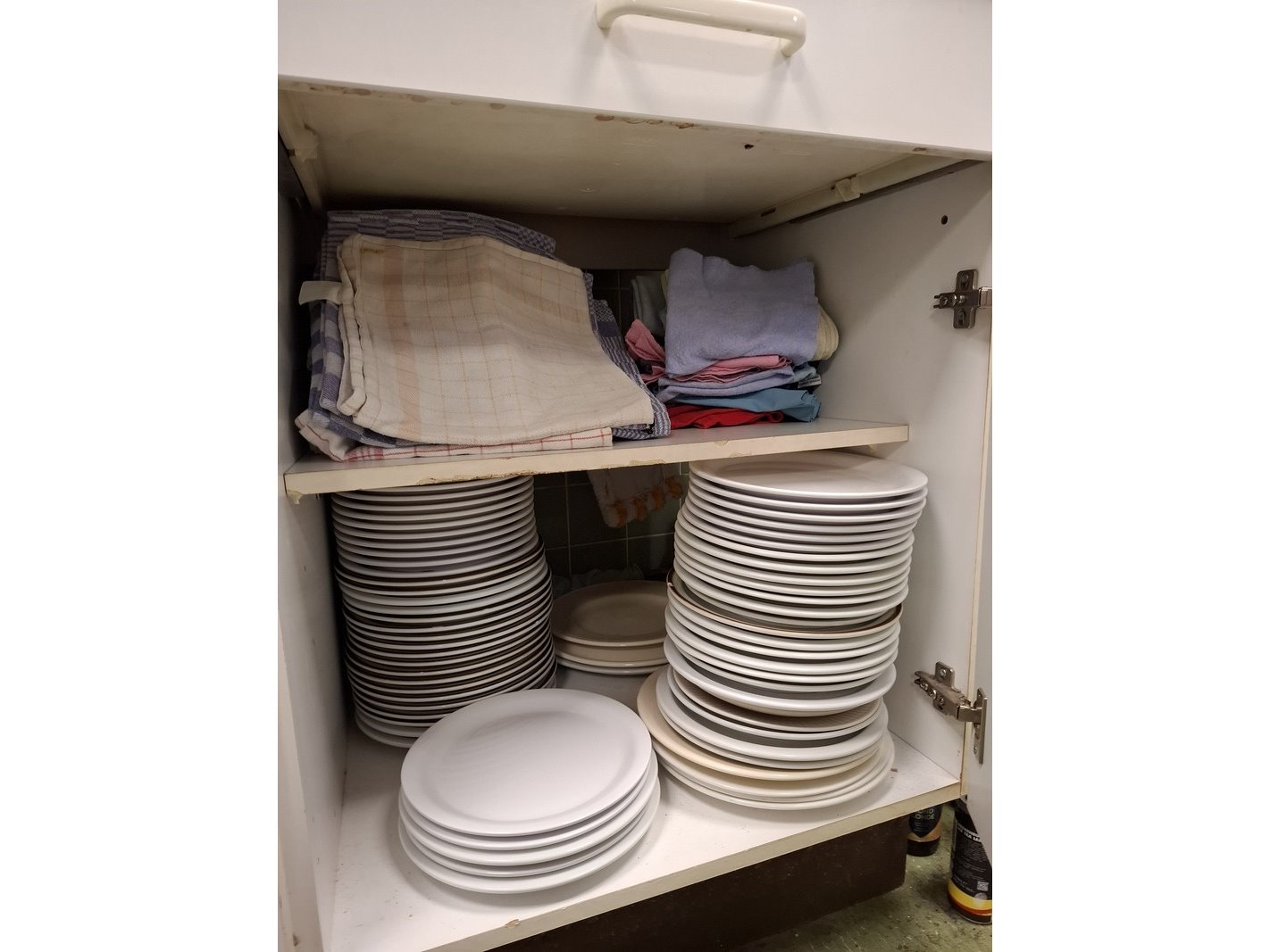 Product: Inhoud keukenblok Specificaties: o.a. schotels, soepkommen, divers glaswerk, snijplanken, bestek, bakjes, borden, schoonmaakdoeken, borrelglazen, pannen, magnetron, etc.