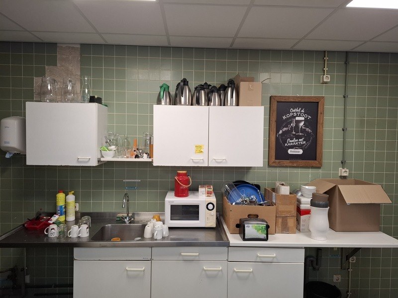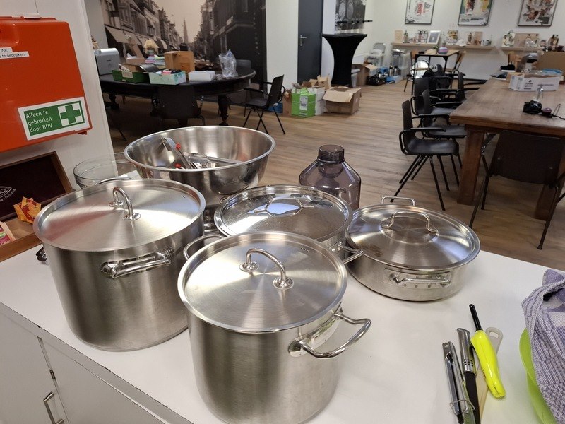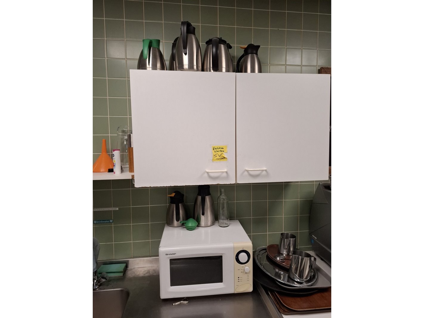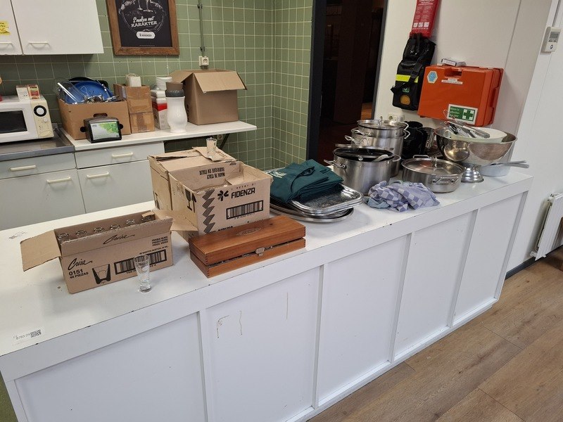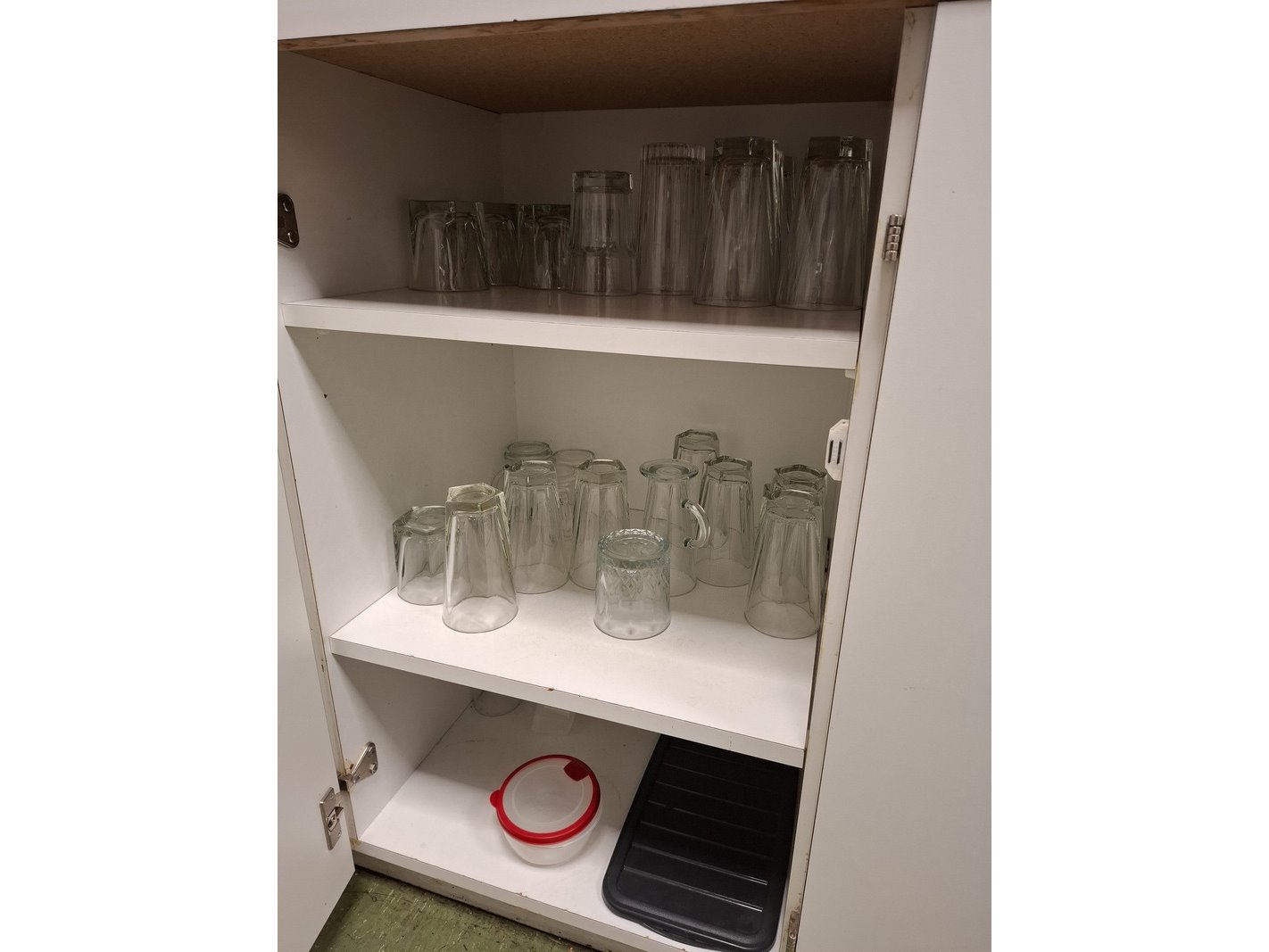 Product: Inhoud keukenblok Specificaties: o.a. schotels, soepkommen, divers glaswerk, snijplanken, bestek, bakjes, borden, schoonmaakdoeken, borrelglazen, pannen, magnetron, etc.