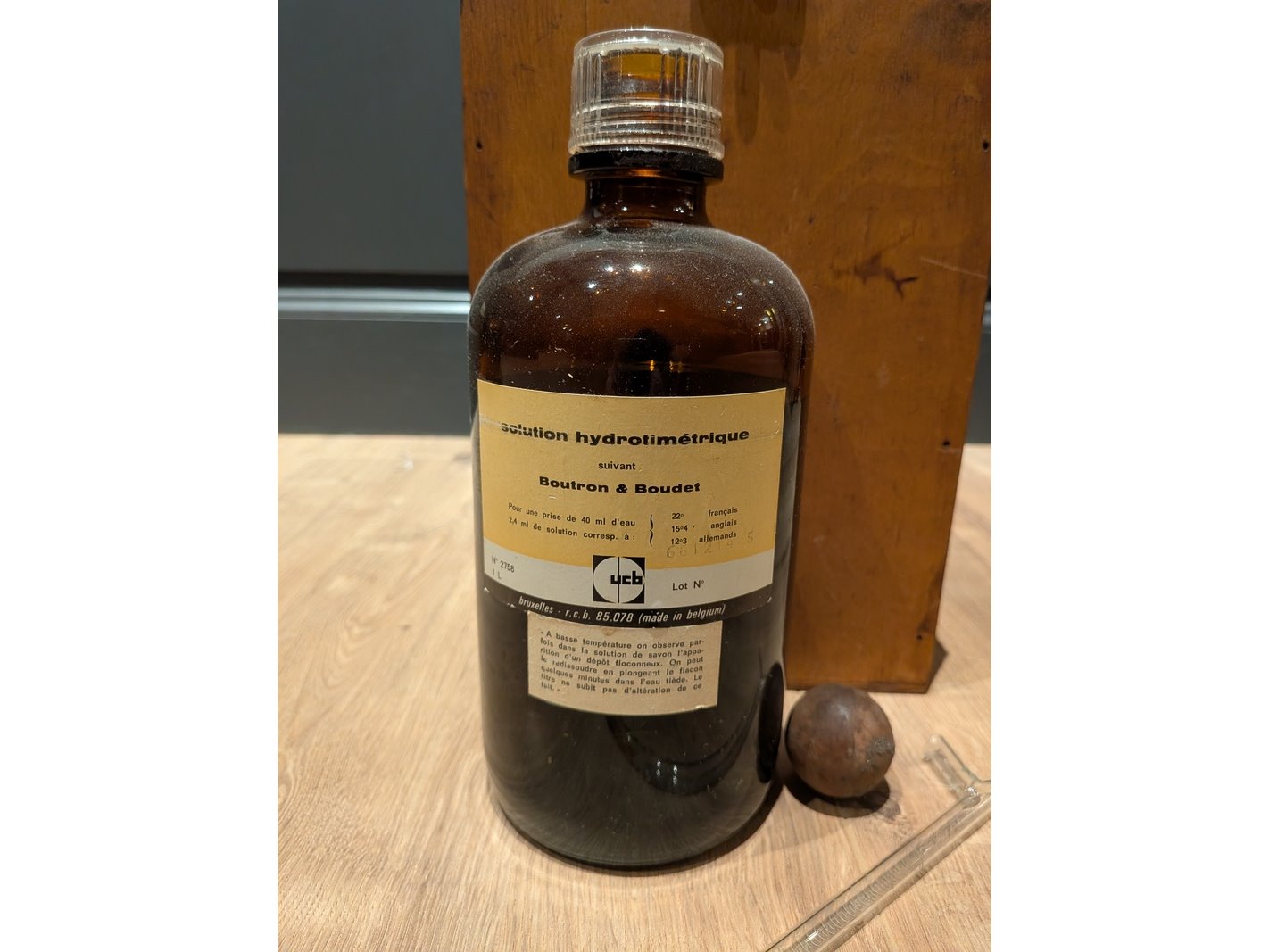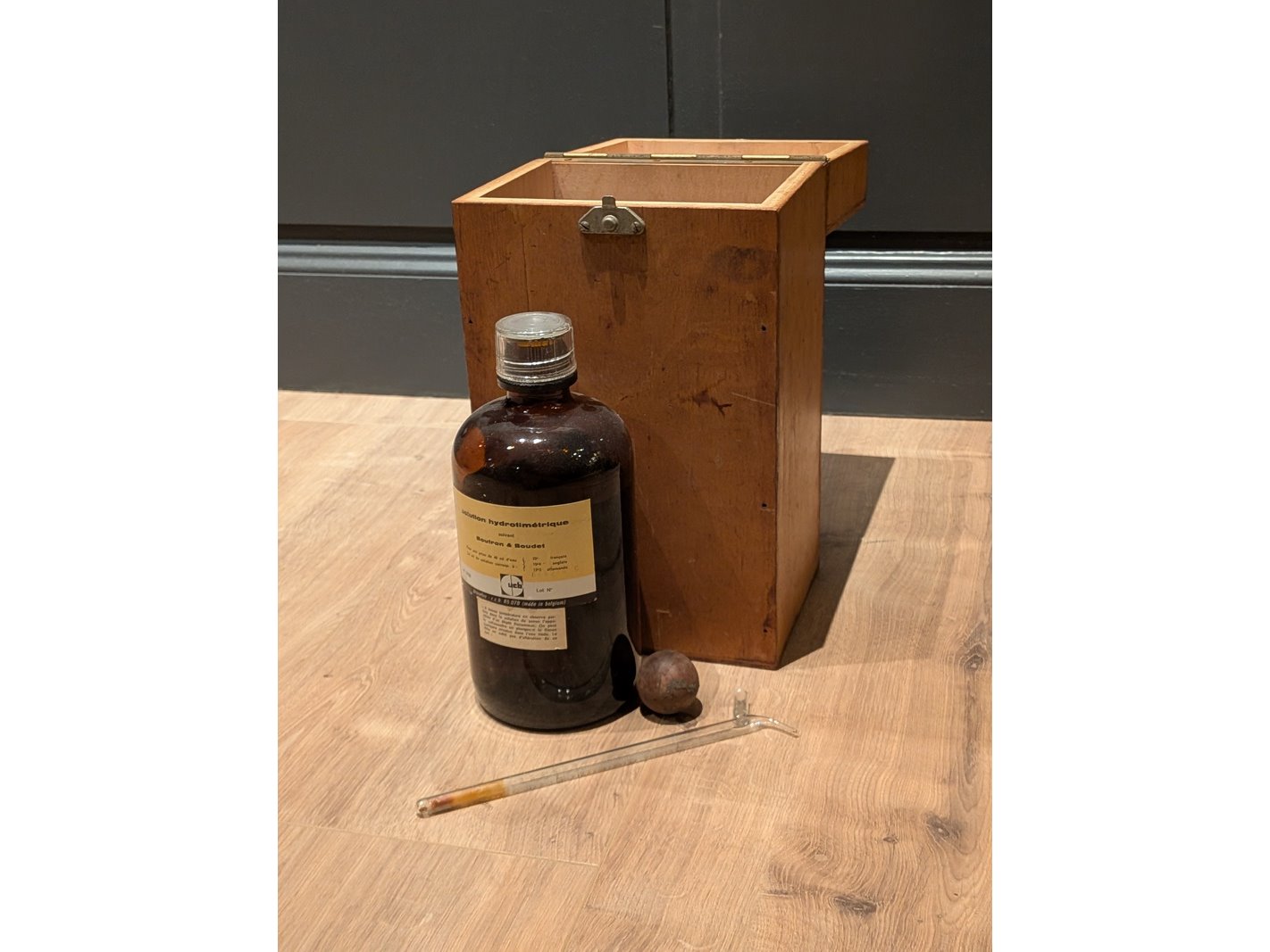 Product: Fles hydrometische oplossing, deels gevuld, incl diverse nostalgische items