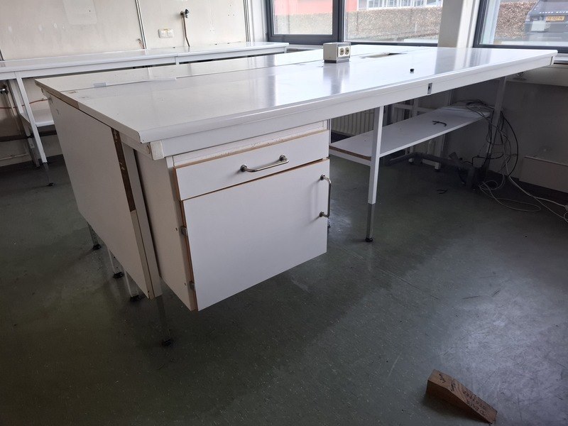Product: Meubilair laboratorium Conditie: Gebruikt Specificaties: Diverse meubels laboratorium Bestaande uit: 1x bureau 160x80cm verstelbaar, ladenblok, 1x lab tafel wit L345xD60xH90 cm, 1x dubbel midden-meubel wit L240xD150xH180cm
