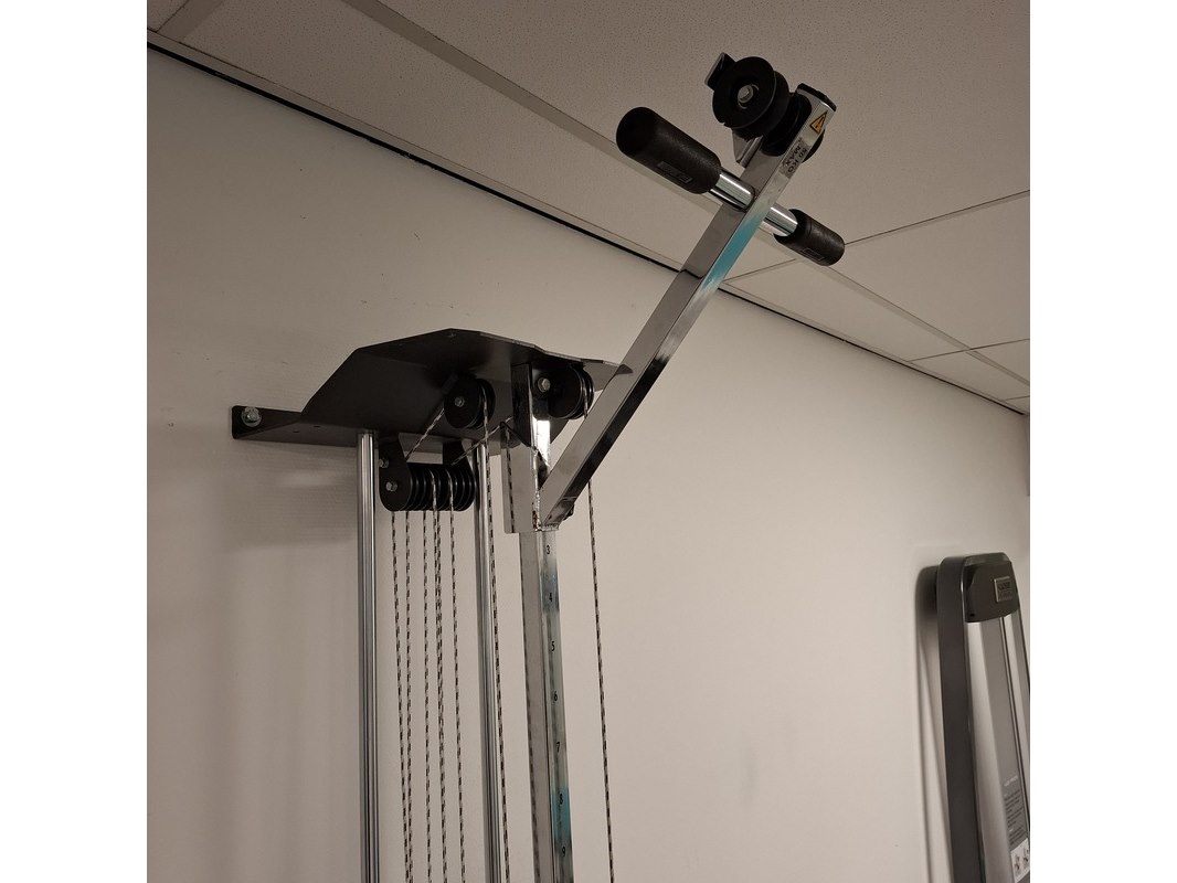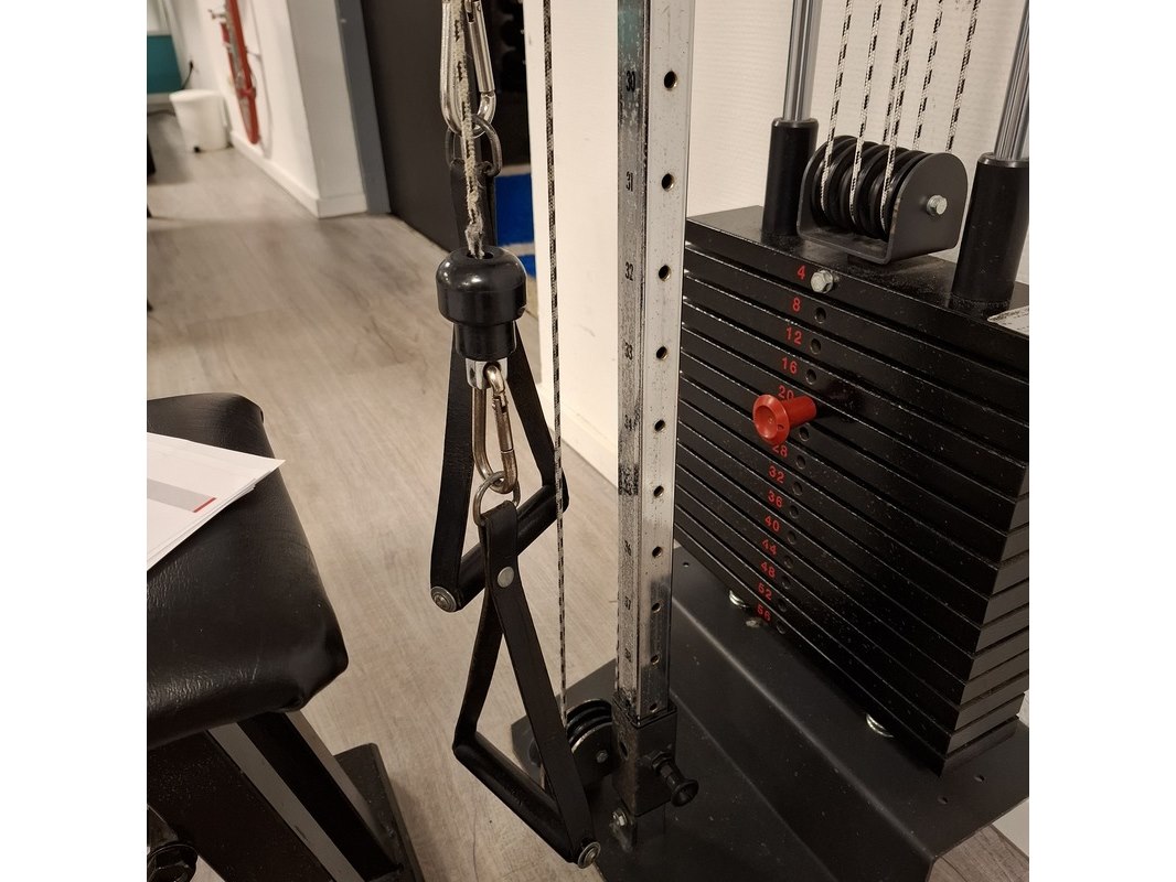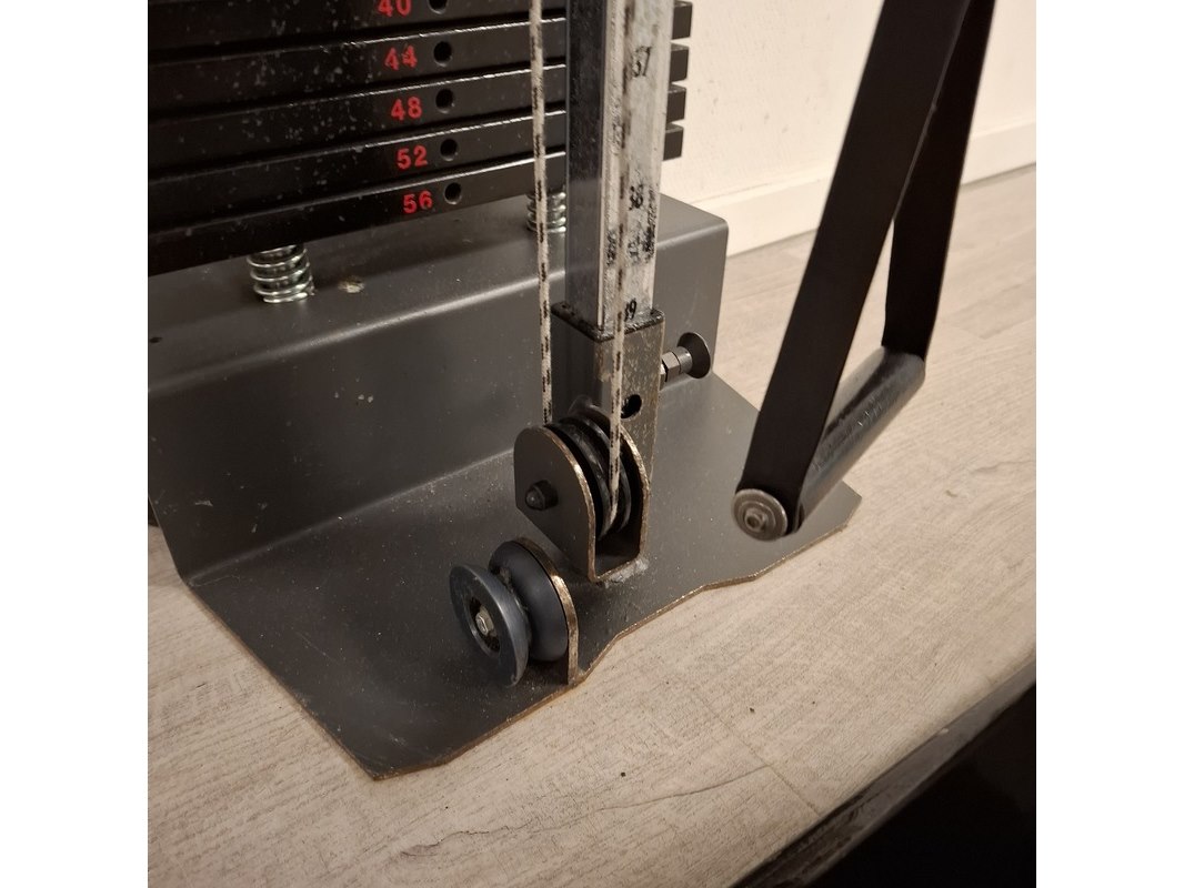 Merk: Gymna Product: Trekapparaat met fitness bankje Afmeting: 4-56 kilo, hxbxd ca. 240x40x40cm Specificaties: is aan de muur gebout