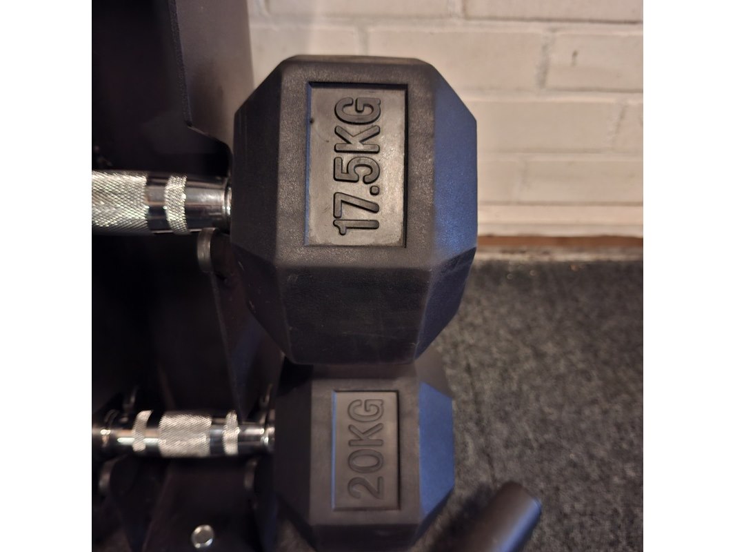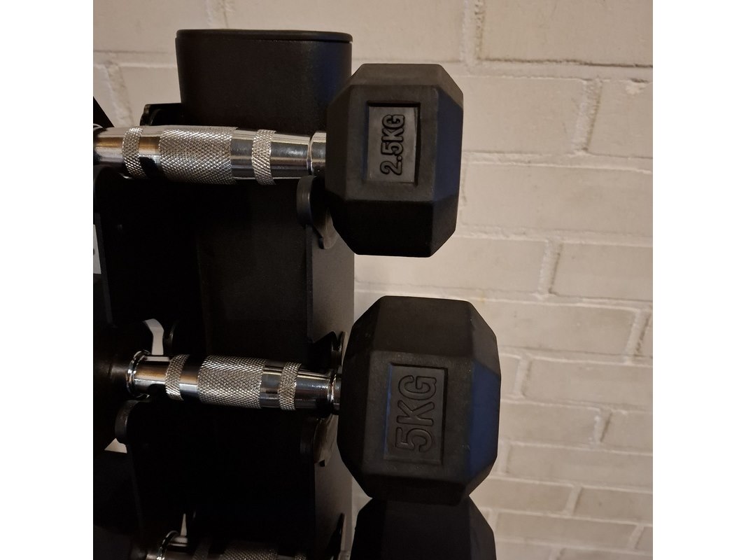 Merk: PT Essentials Product: Dumbellrek Afmeting: hxbxd ca. 133x100x57cm Specificaties: 2,5 - 5 - 7,5 - 10 - 12,5 - 15 - 17,5 - 20 kilo