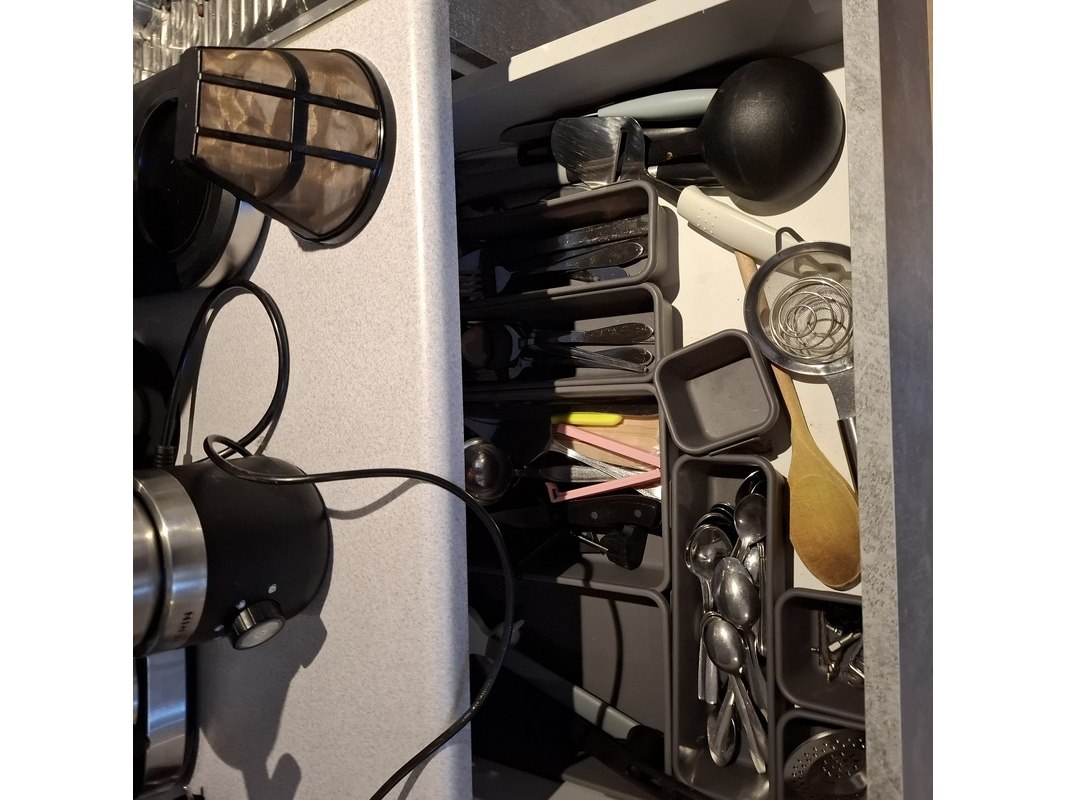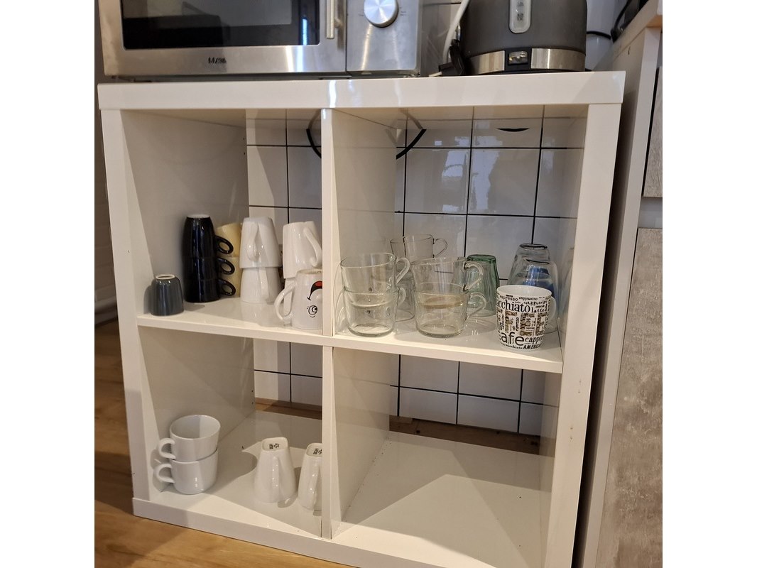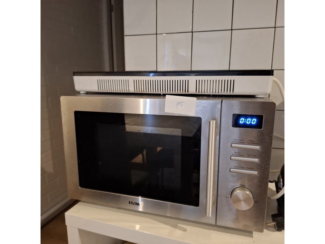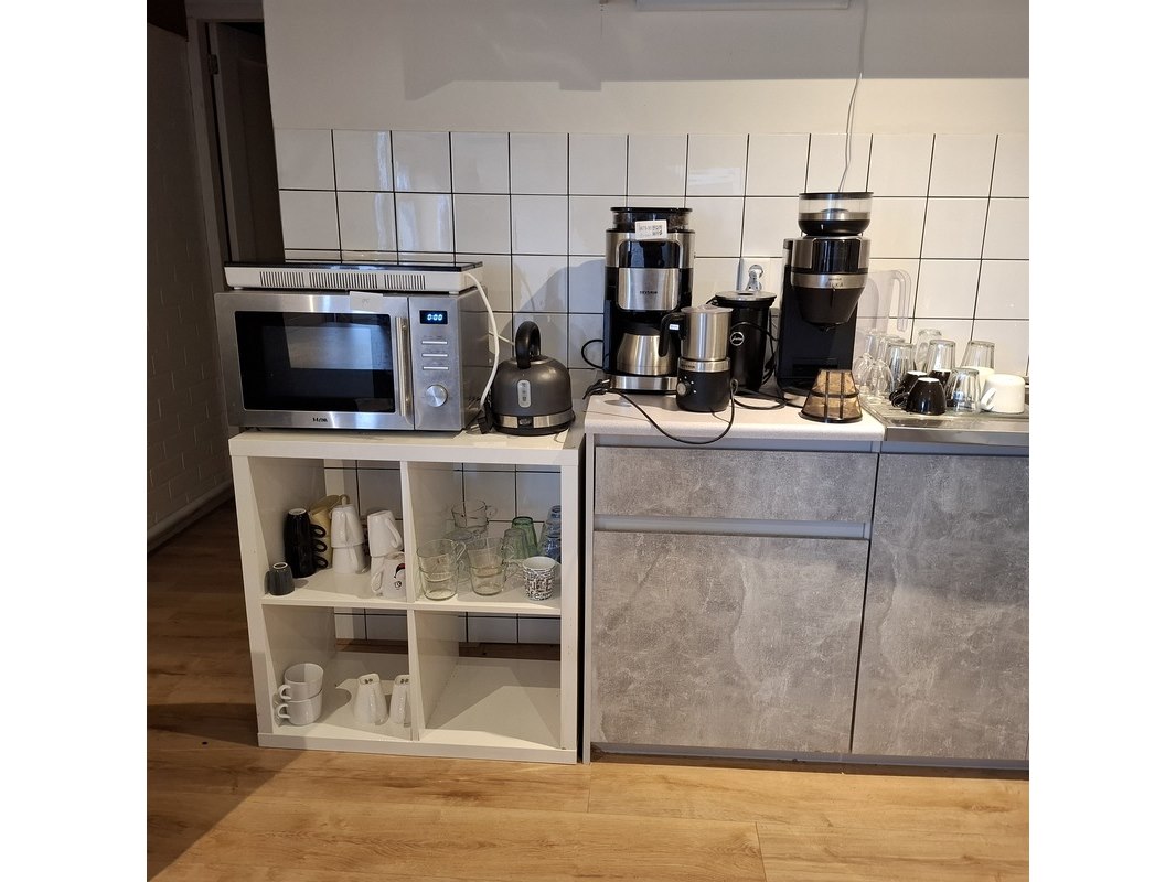 Product: Inhoud keukenblok Specificaties: bestaande uit o.a. : koffiezetapparaat, waterkoker, magnetron, 2 zone inductieplaat, melkopschuimer, kopjes, bestek, bordjes, etc.