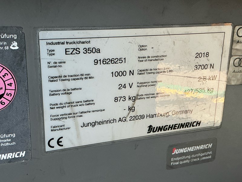 Merk: Jungheinrich Product: Elektro trekker Kleur: geel Materiaal: staal Afmeting: L1800 x B900 x H2700mm BouwJaar: 2018 Conditie: gebruikt Specificaties: Bedrijfsuren: 7784 voltage 24 battery type D. Serial number: 91626251 Industriele trekker voor het verplaatsen van goederen in magazijnen, fabrieken, vliegvelden, en soortgelijke doeleindes