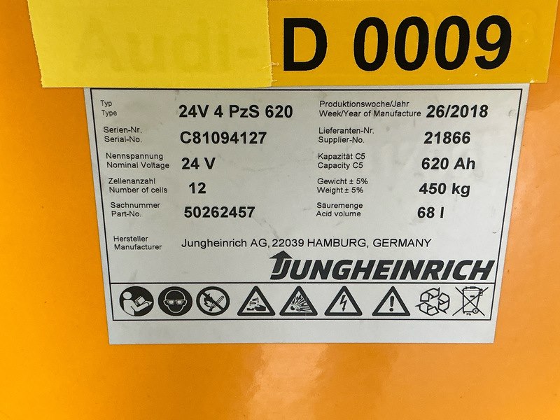Merk: Jungheinrich Product: Elektro trekker Kleur: geel Materiaal: staal Afmeting: L1800 x B900 x H2700mm BouwJaar: 2018 Conditie: gebruikt Specificaties: Bedrijfsuren: 8025 voltage 24 battery type D. Serial number: 91626253 Industriele trekker voor het verplaatsen van goederen in magazijnen, fabrieken, vliegvelden, en soortgelijke doeleindes Draaiuren: ca. 8025